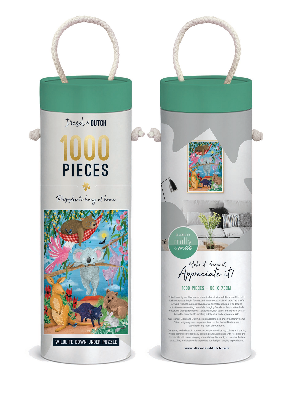 This vibrant jigsaw illustrates a whimsical Australian wildlife scene filled with lush eucalyptus, bright flowers, and a warm outback landscape. The playful artwork features our most loved native animals.