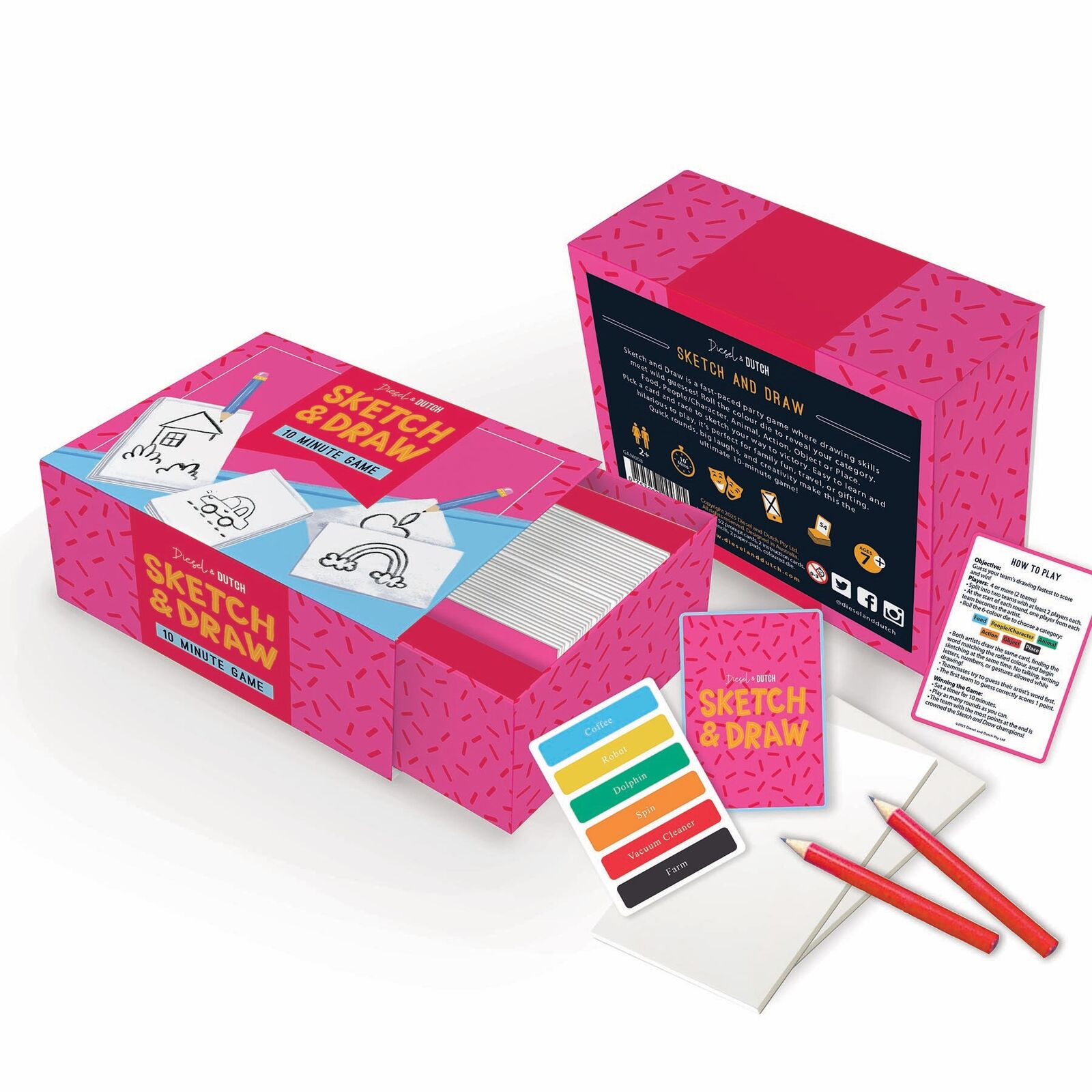 Sketch and Draw is a fast-paced party game where drawing skills meet wild guesses! Roll the colour die to reveal your category: Food, People/Character, Animal, Action, Object or Place. Pick a card and race to sketch your way to victory.