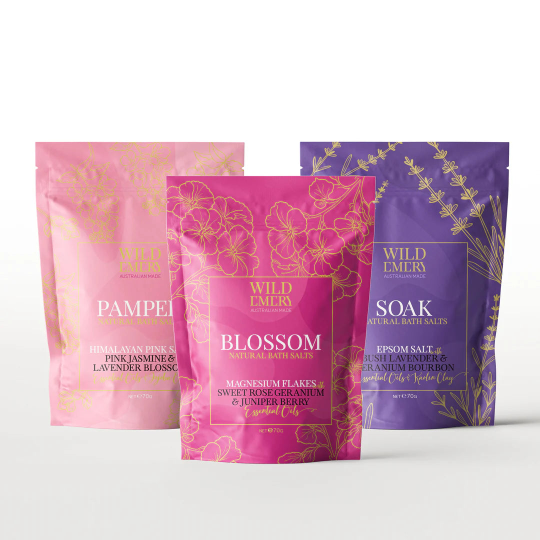 Three unique mini bath salt sachets. Australian Made.