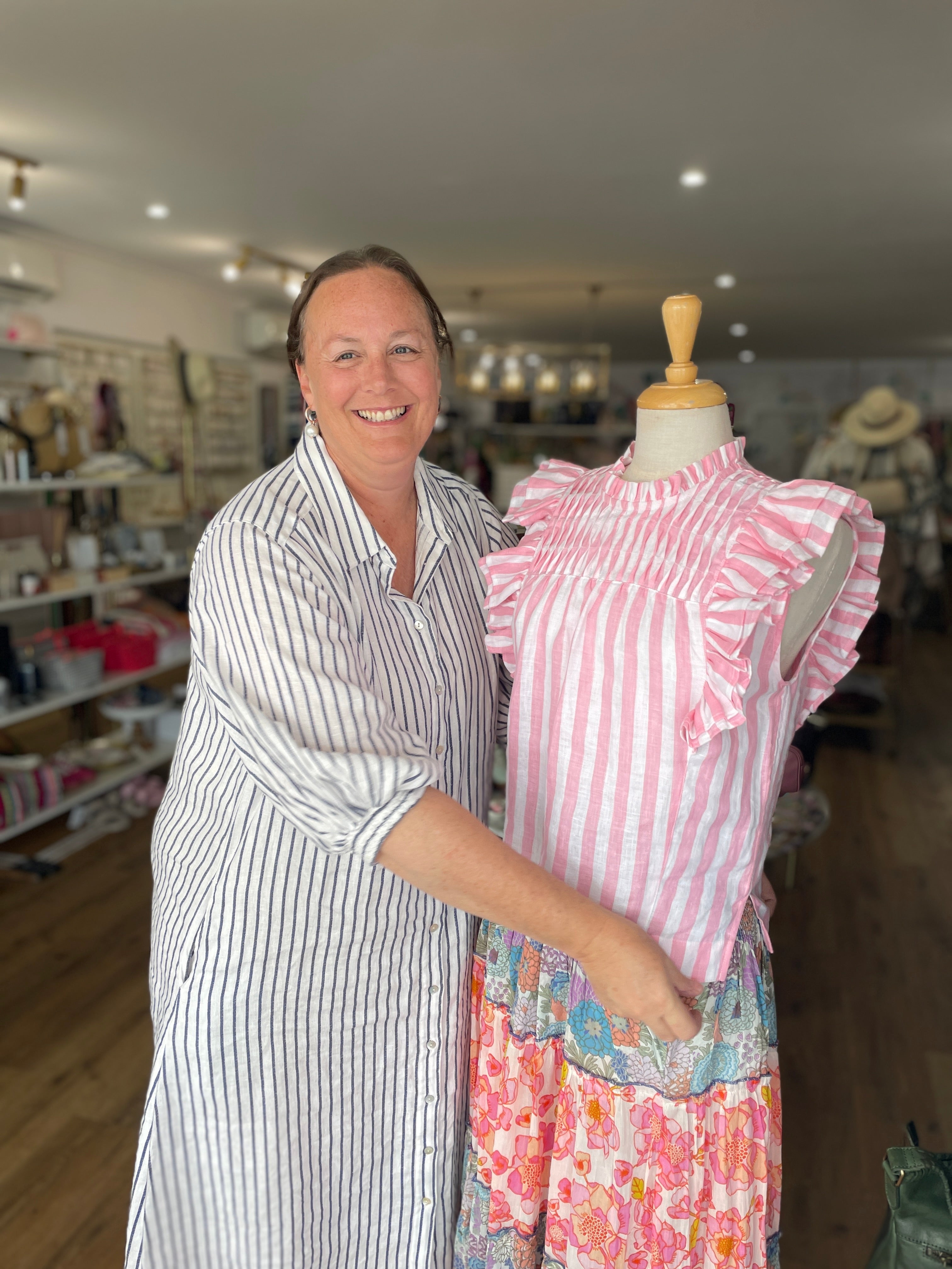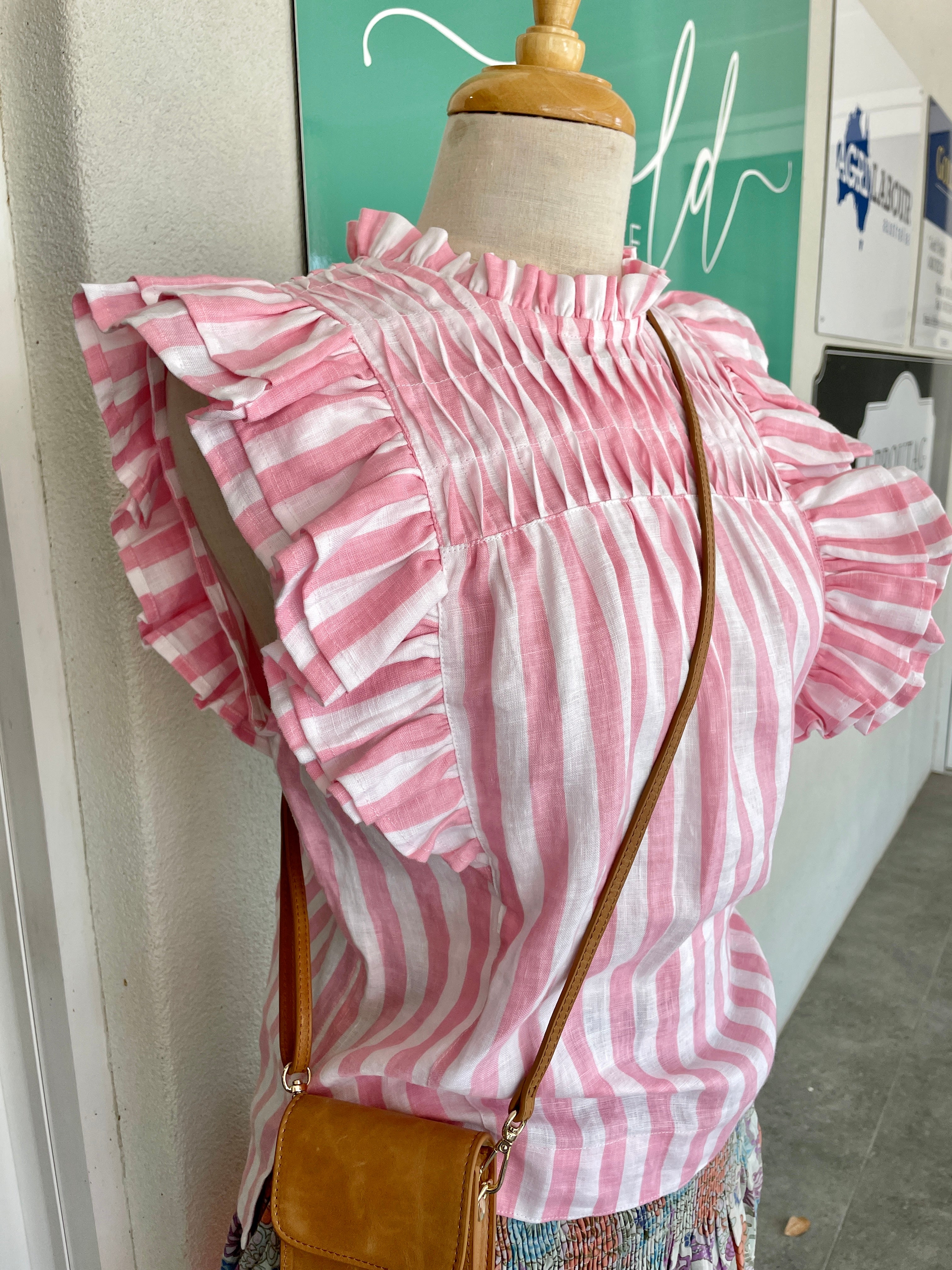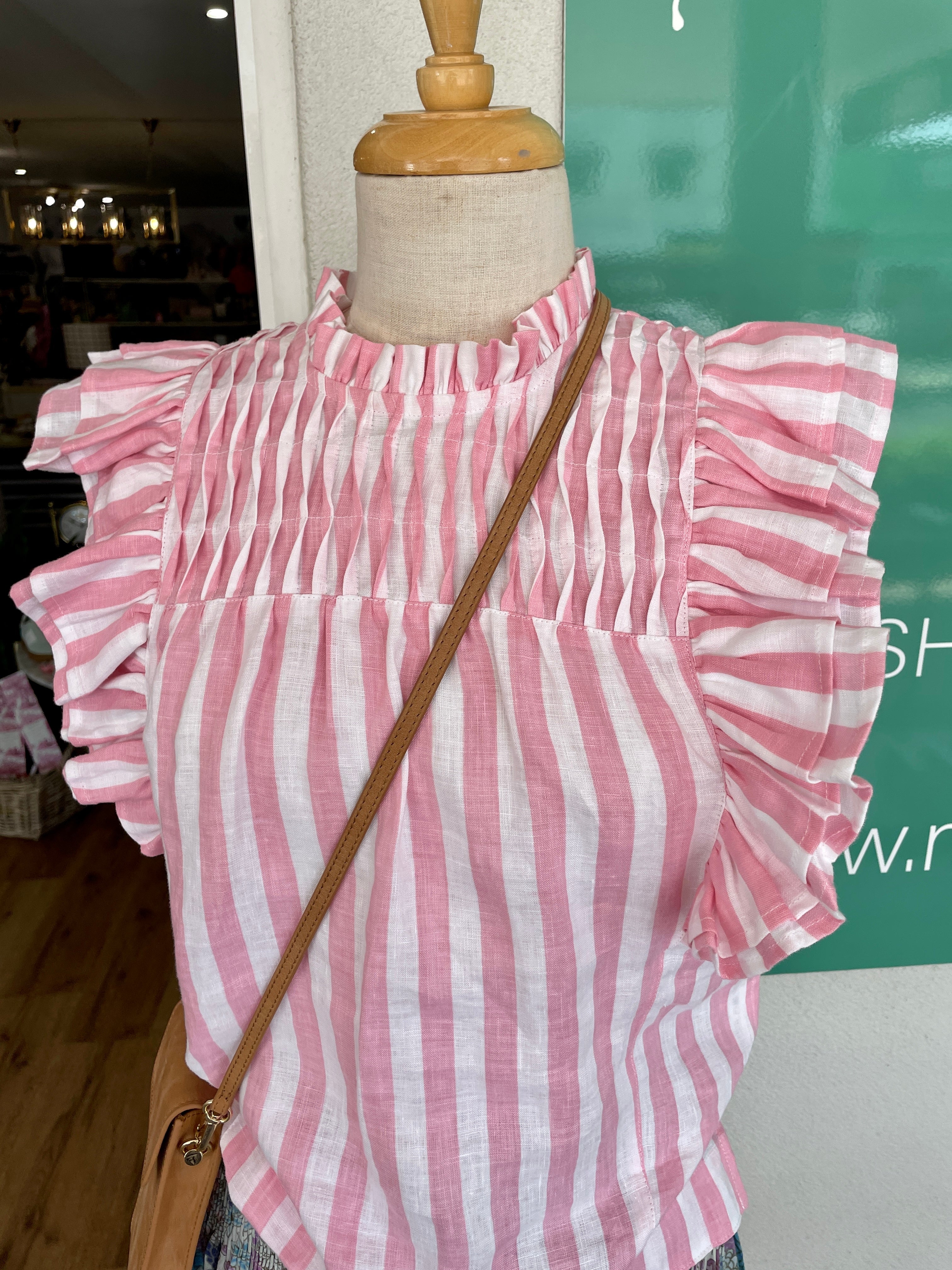 Sleeveless Top Ruffle Shoulder Trim Button Back Neck Closure Bib Front Feature Round Ruffle Neck Side Splits for ease to tuck in Contrasting Horizontal and Vertical Panels Fits True To Size
