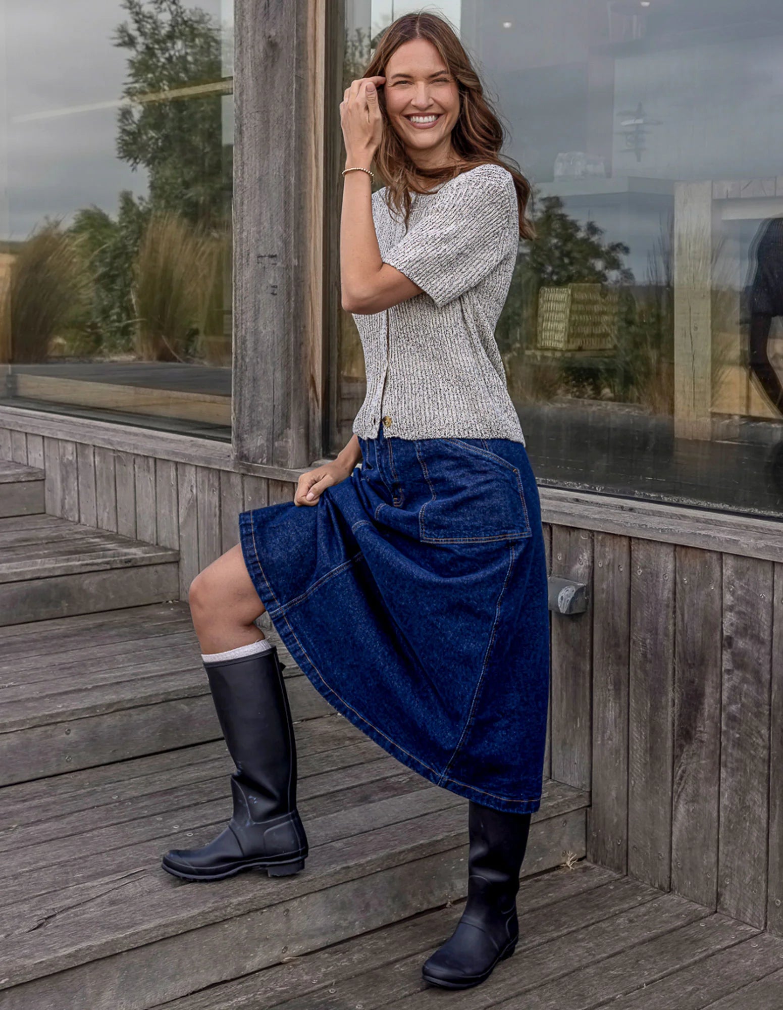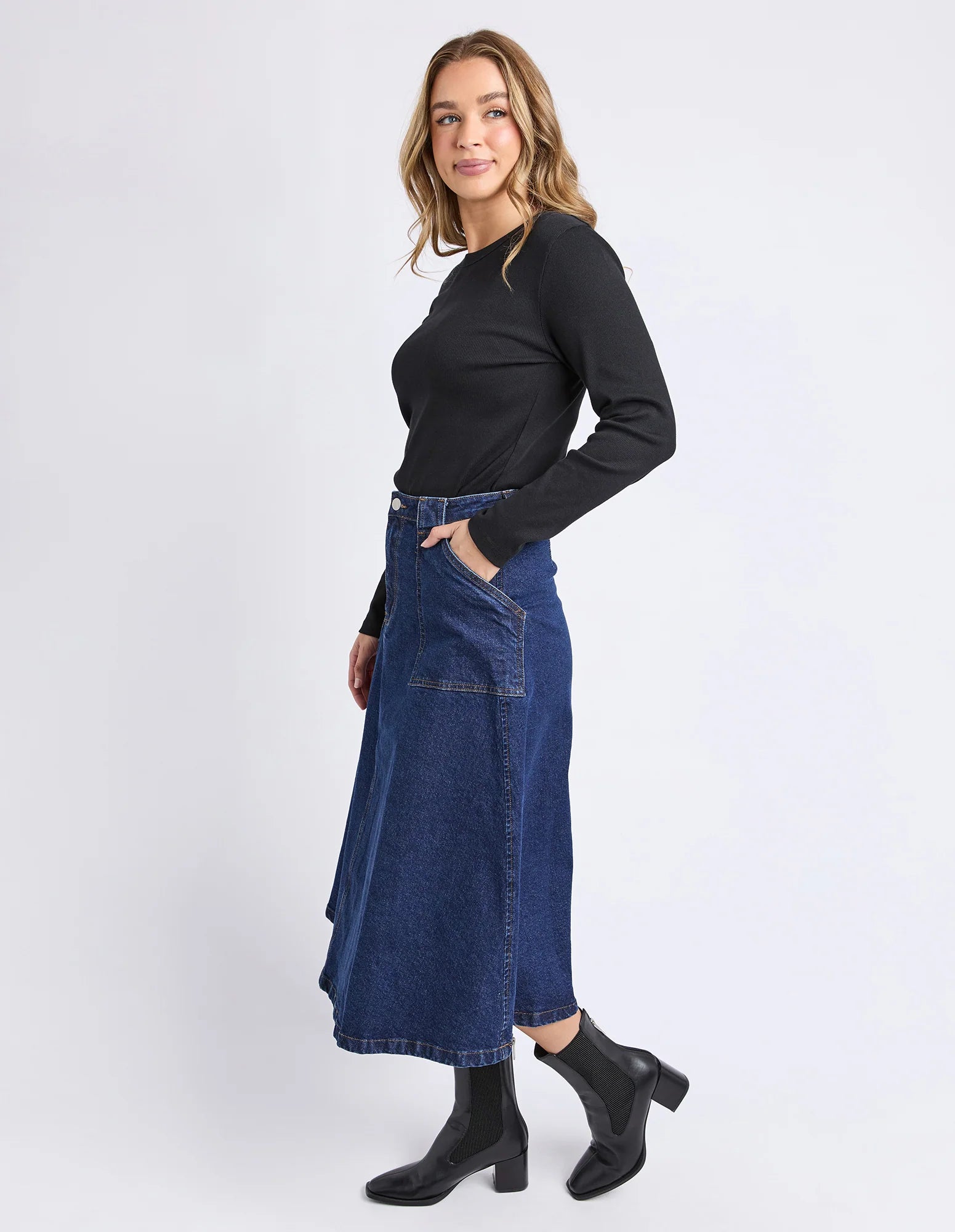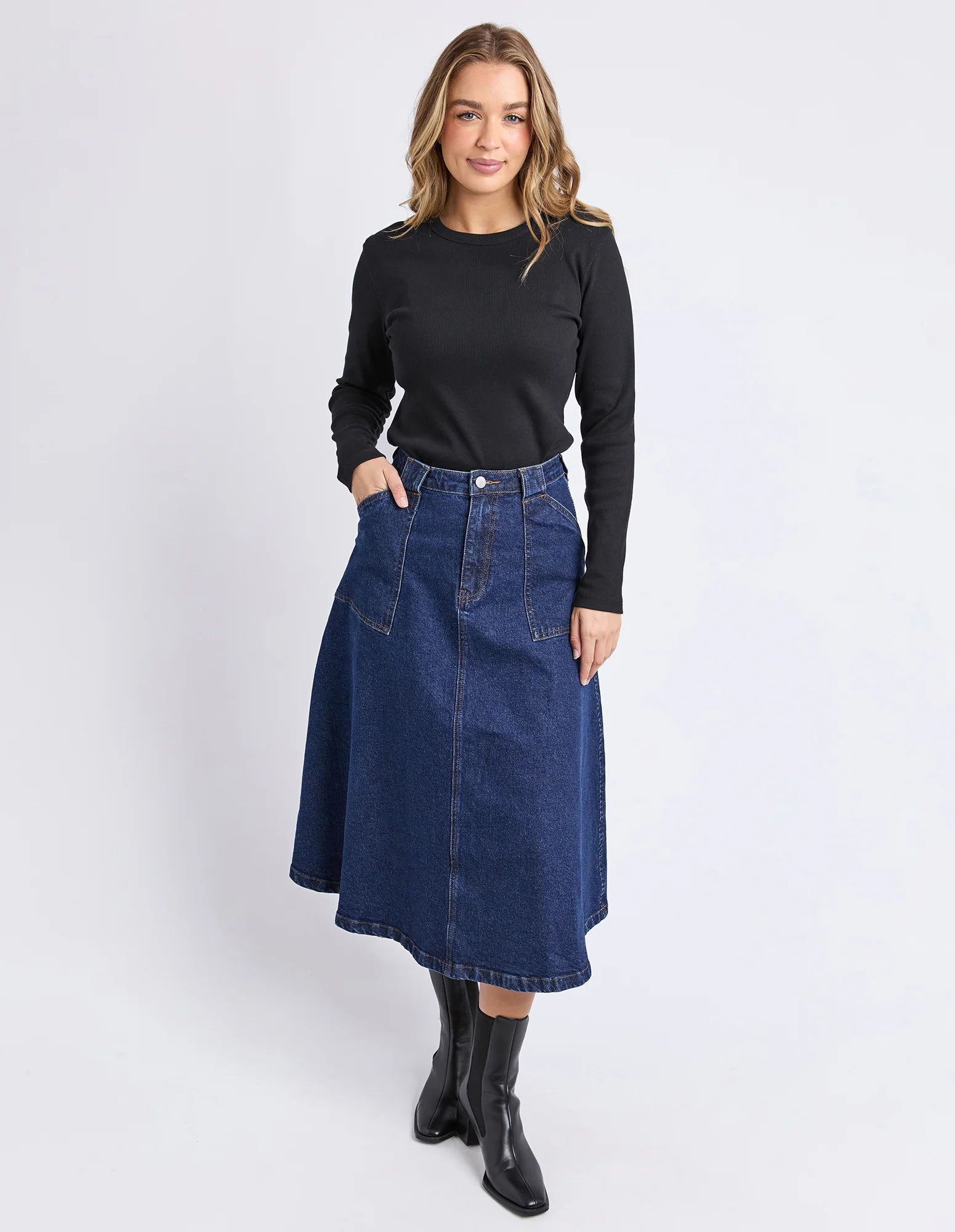 The Potter Skirt brings a modern spin to classic denim with its full, easy-moving shape and clean front fly.