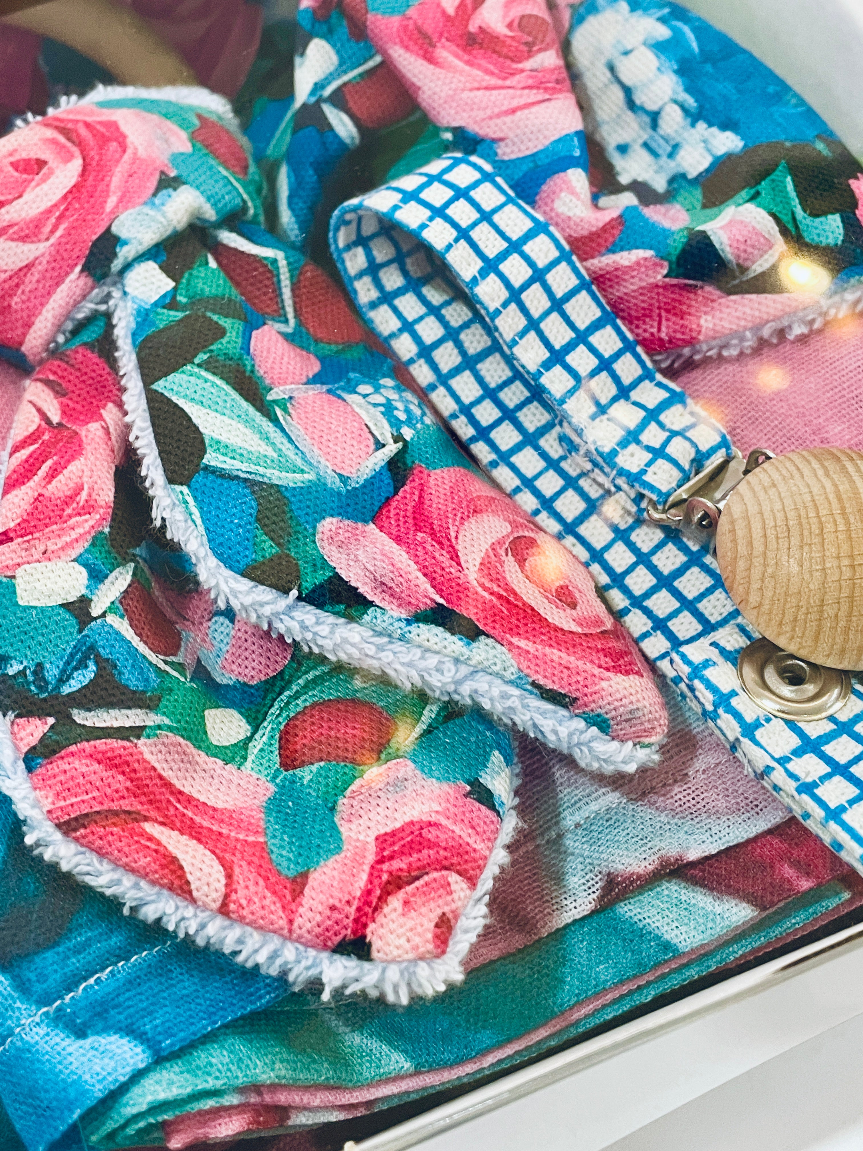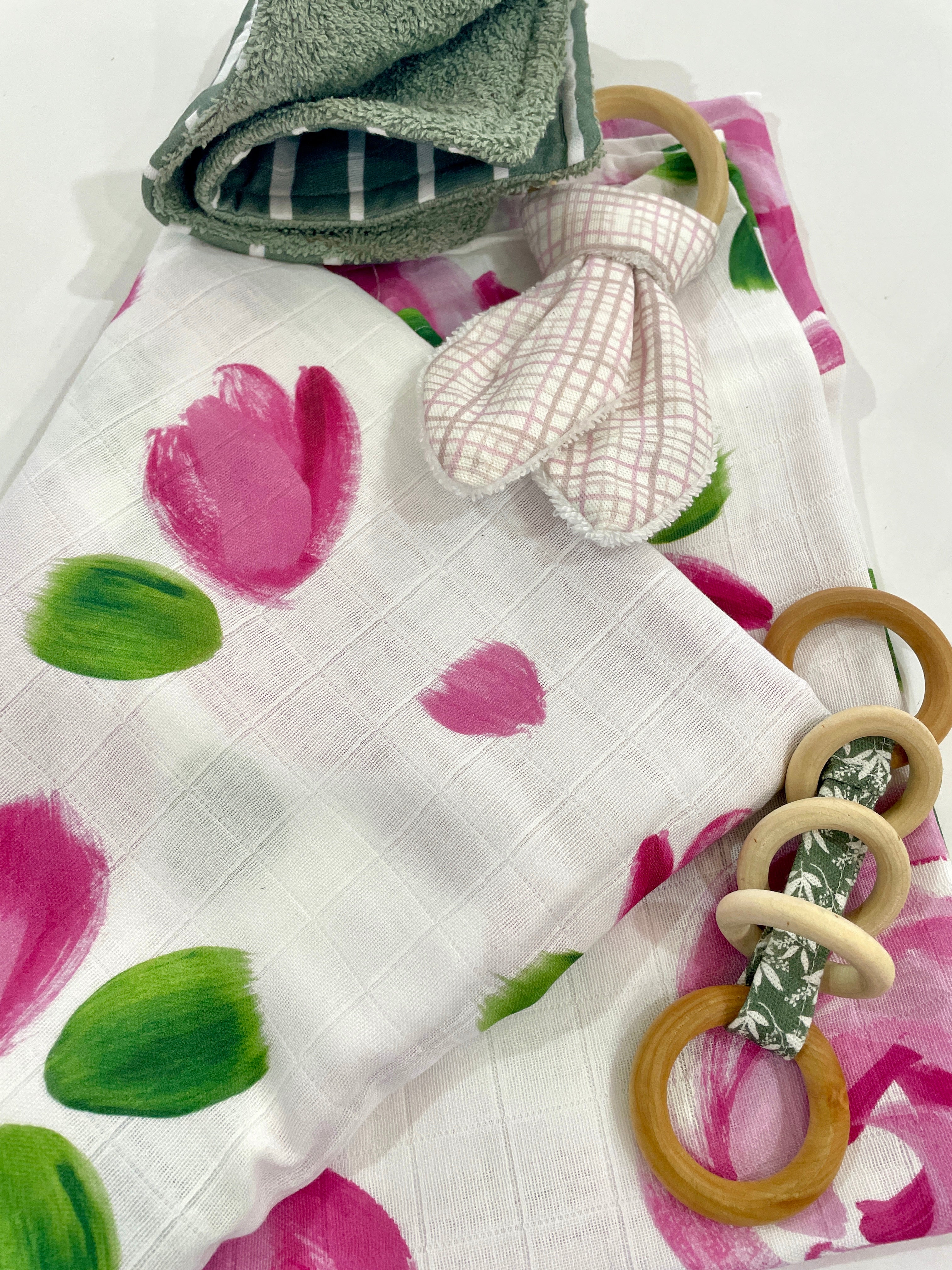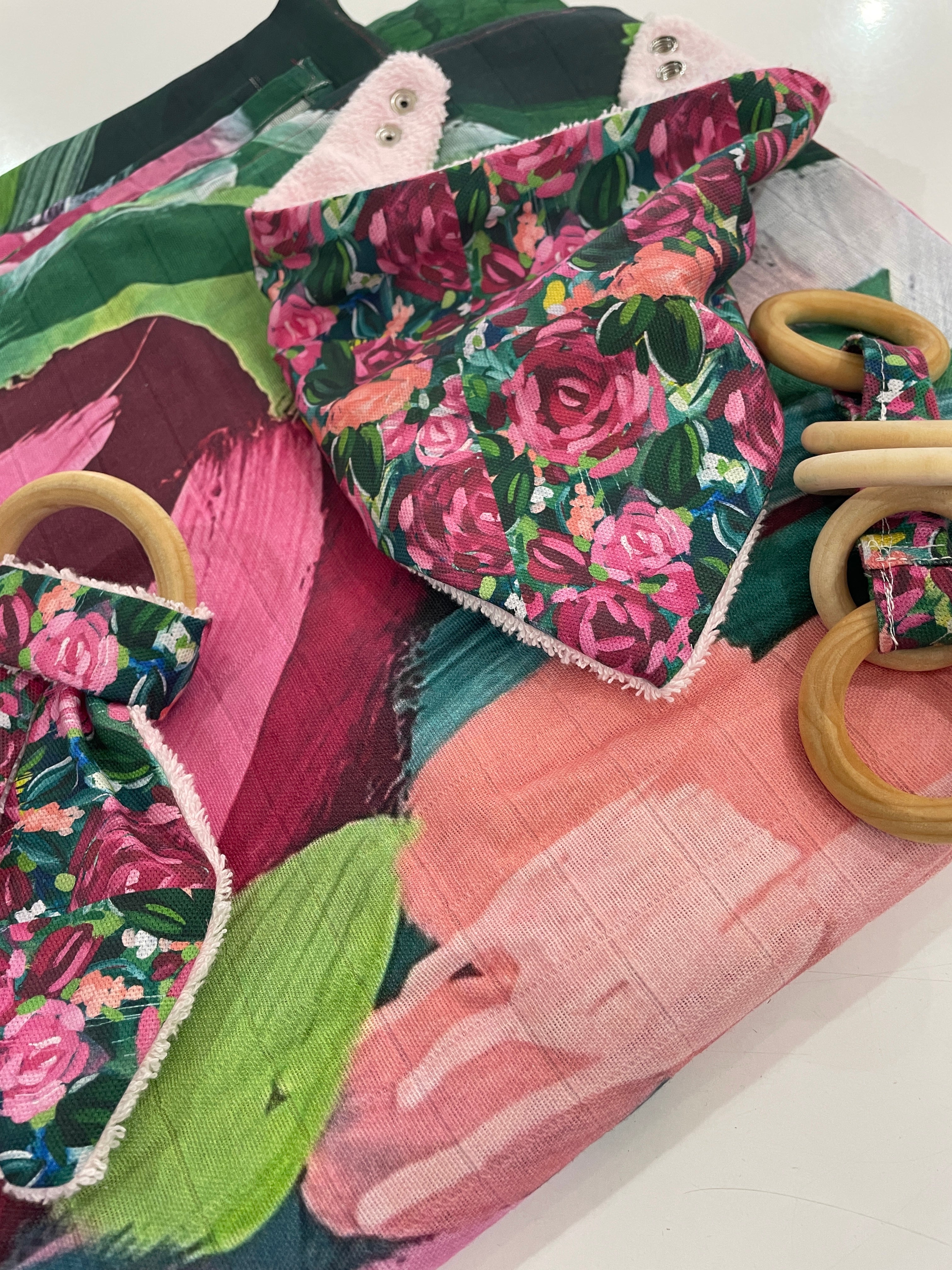 Roses - Muslin Swaddle, Towelling Wash Cloth, Teething Toy, Toy