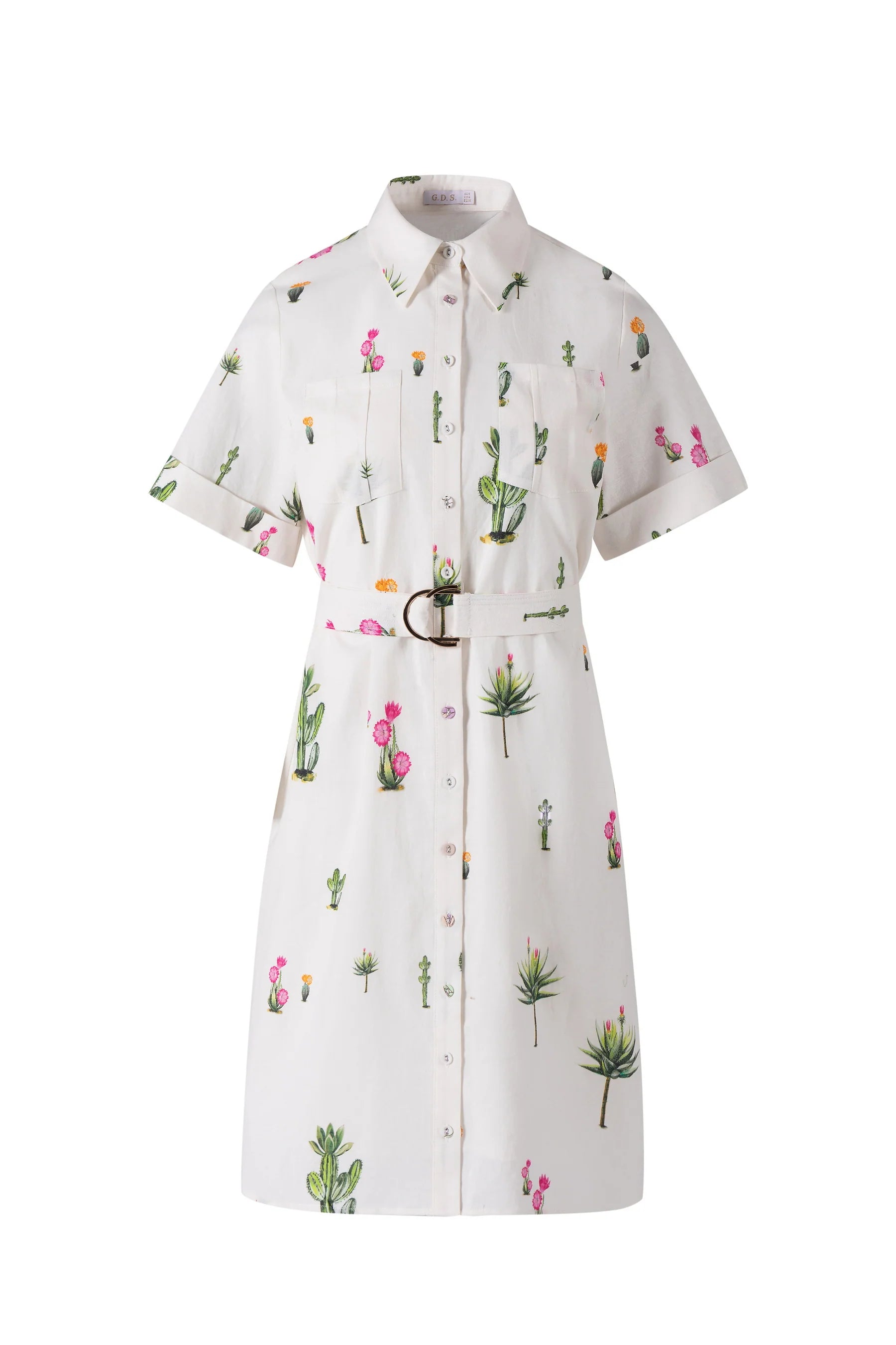 We love this fresh, linen dress featuring a scattering of cactus species with colorful flowers. Easy to wear, great protection from the sun with a collar and decent length sleeve.