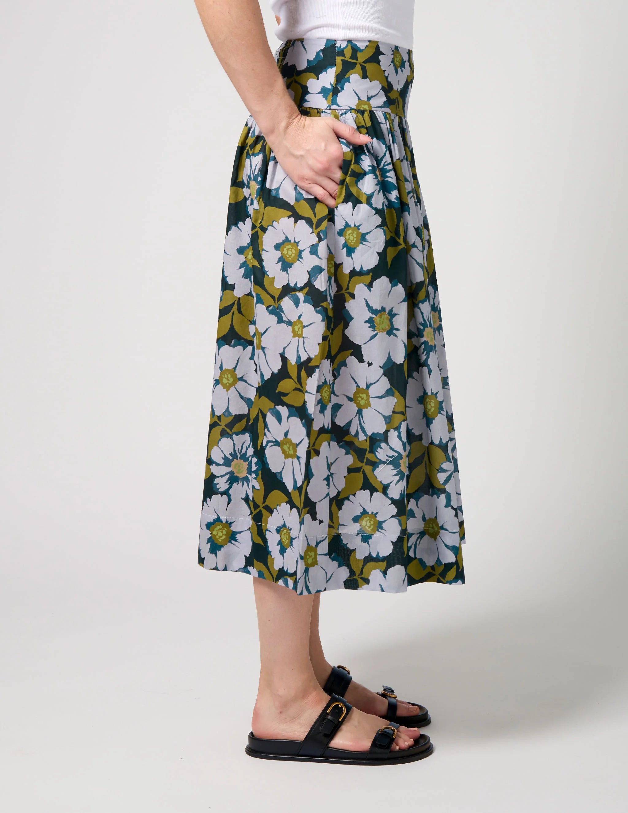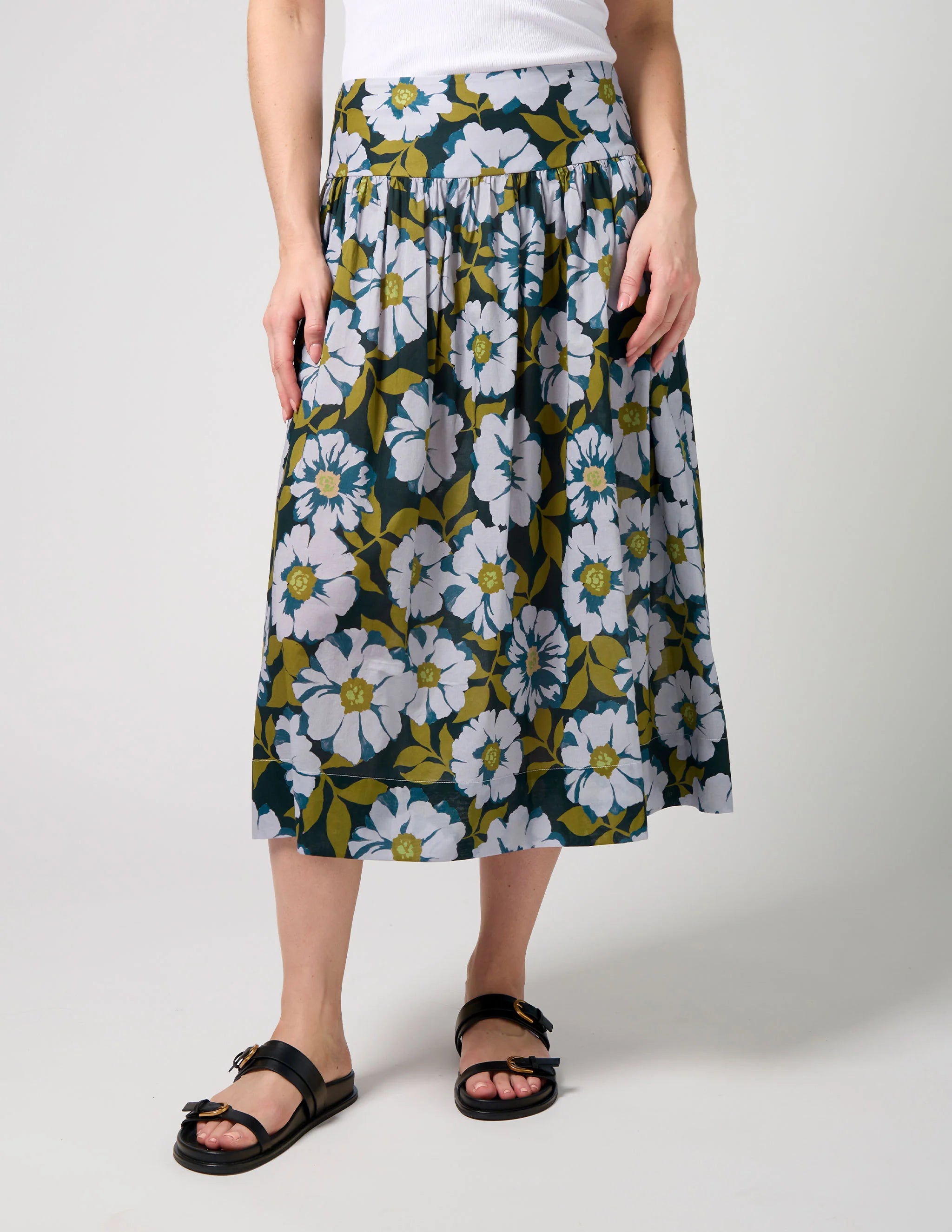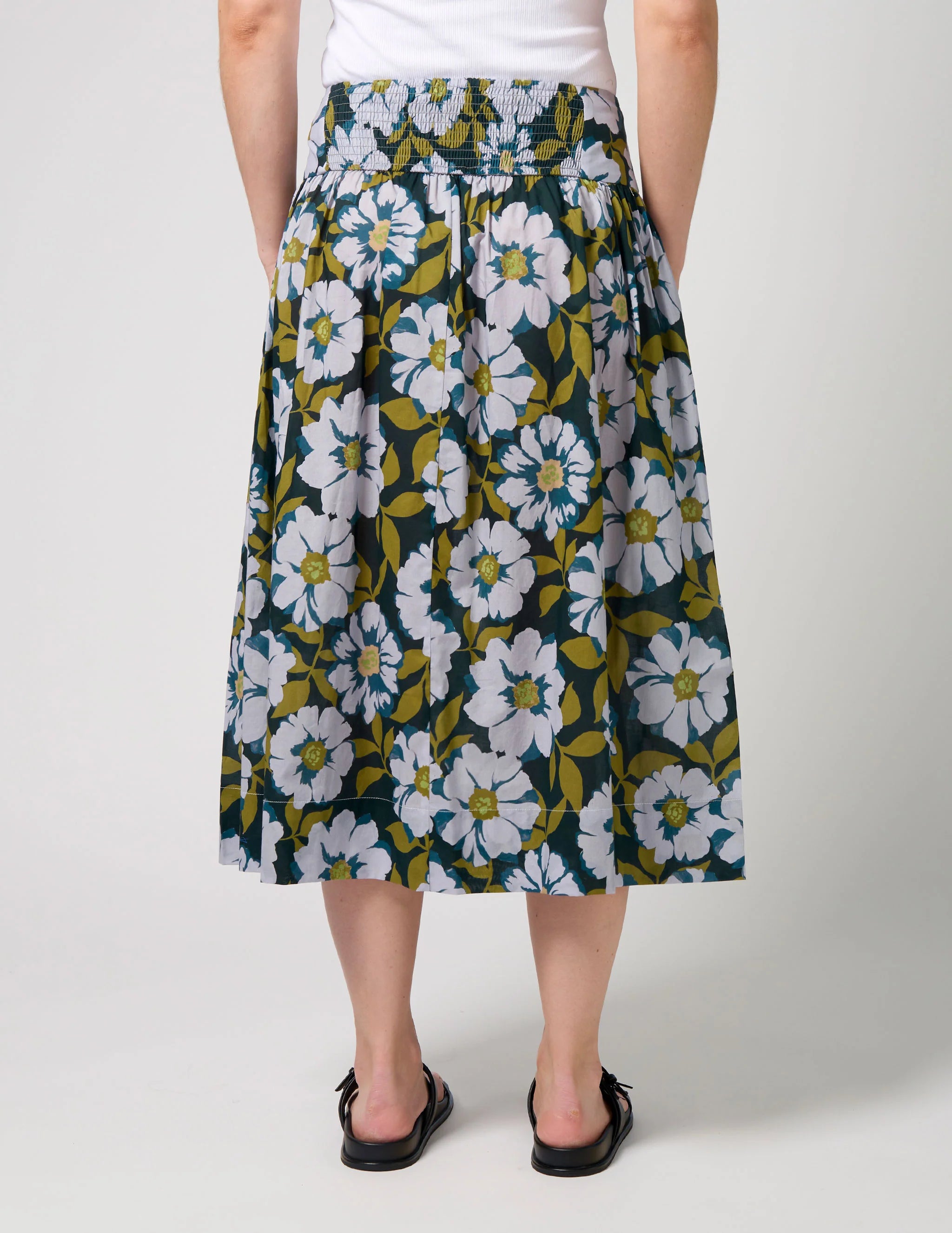 Midi length skirt Flat front waist basque and back waist shirring panel