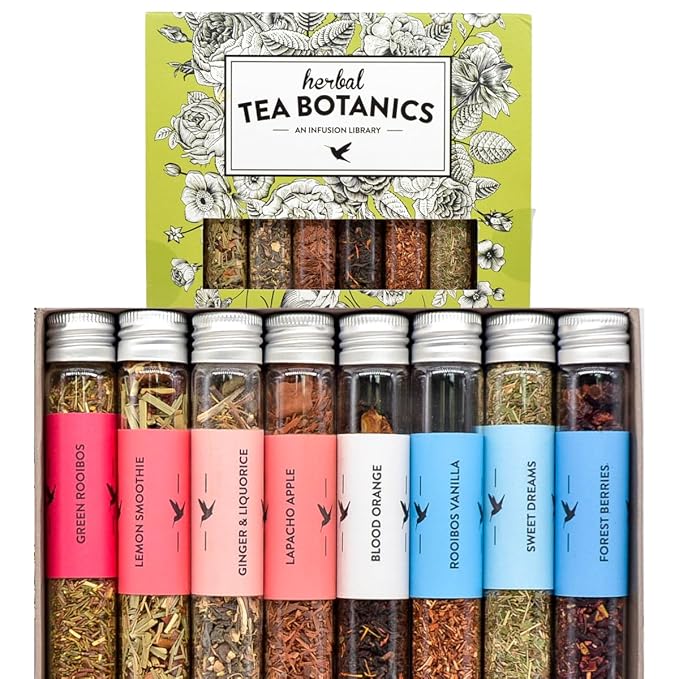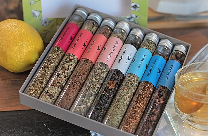 This beautiful tea gift box set includes 8 uniquely tea leaf blends of varying tastes in individual glass tubes.