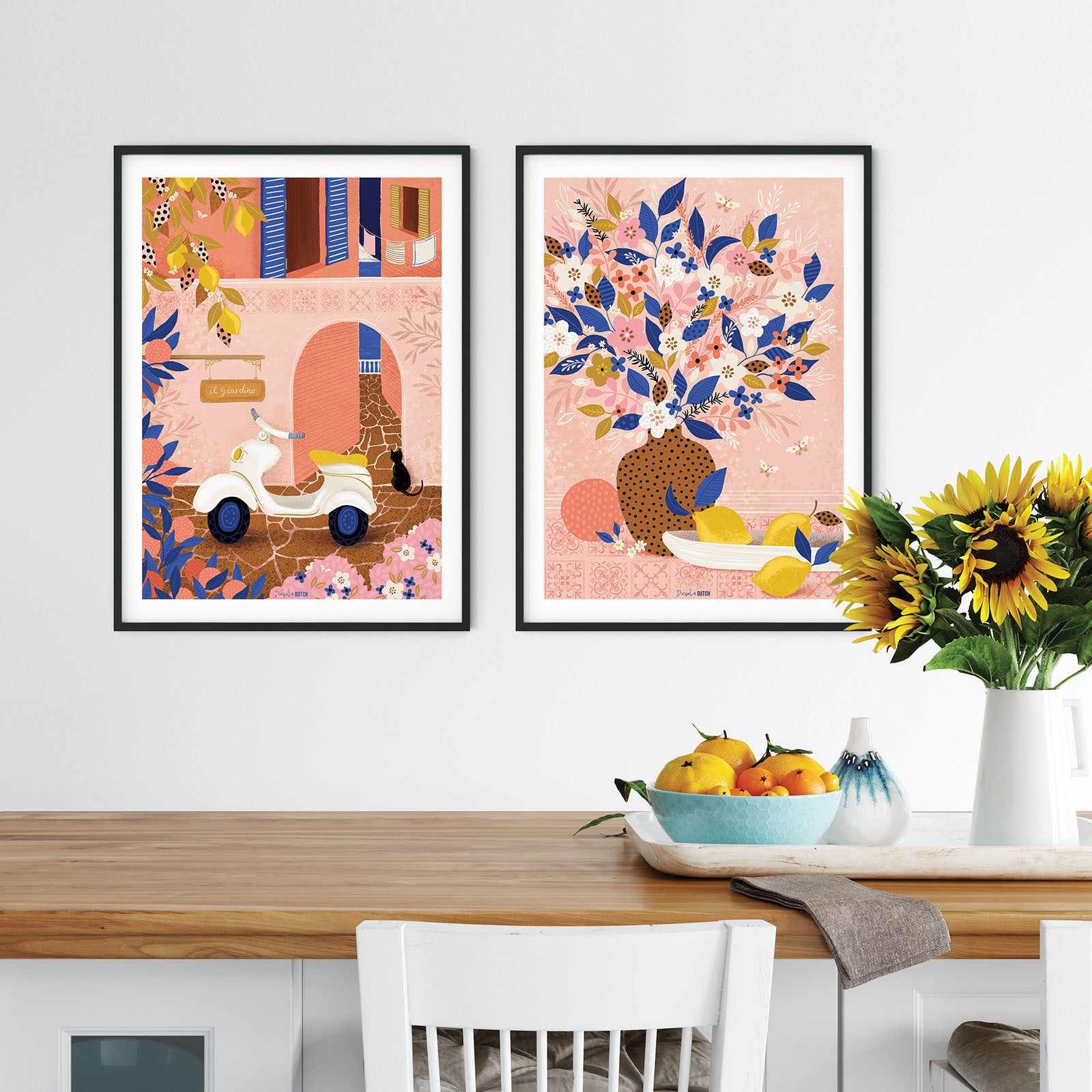 A striking pairing of peach and cobolt blue come together in this hidden garden. Nestled amongst the paved Italian lane ways, an iconic Vespa awaits its riders, ready to take them to their next adventure.