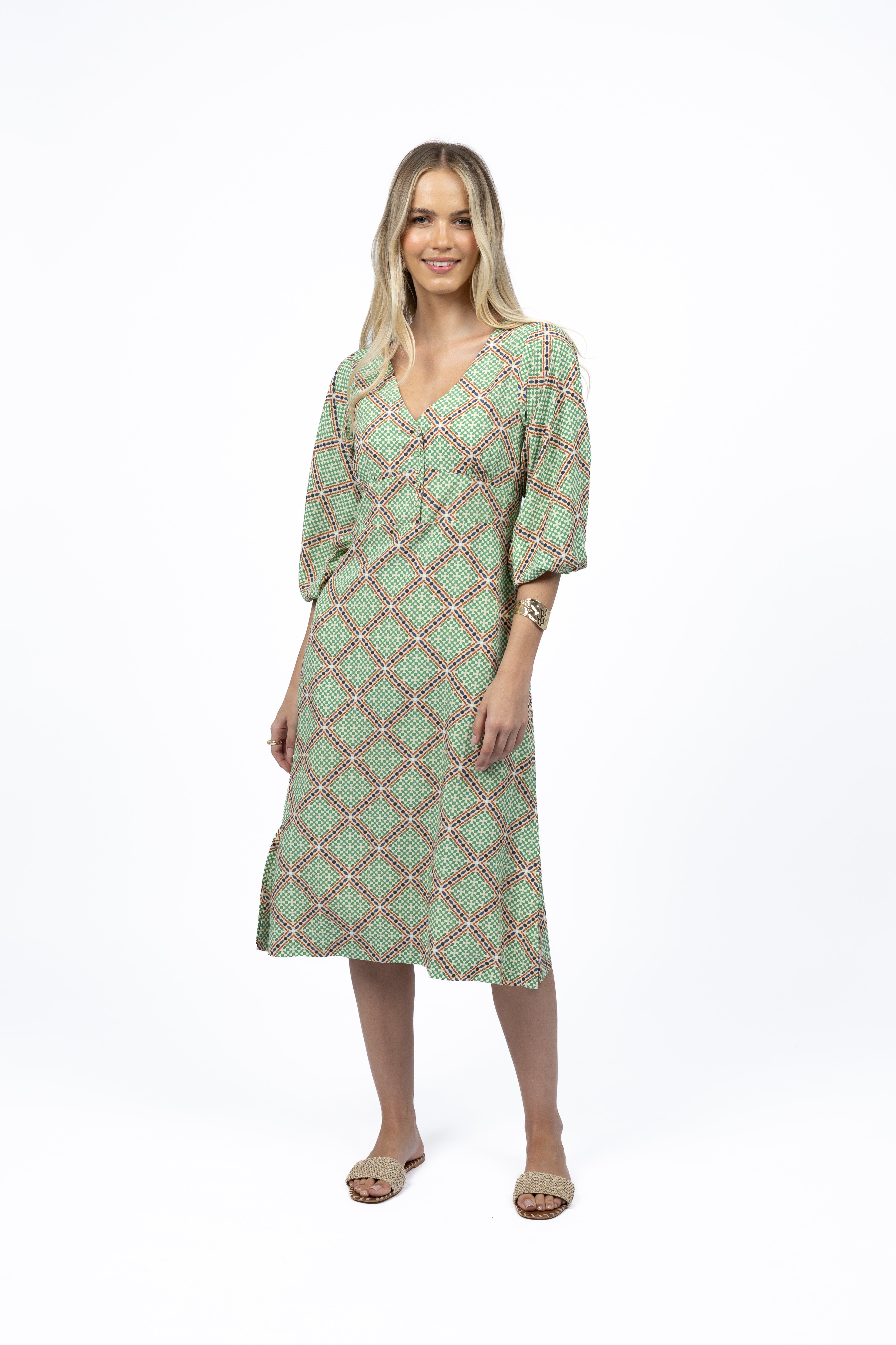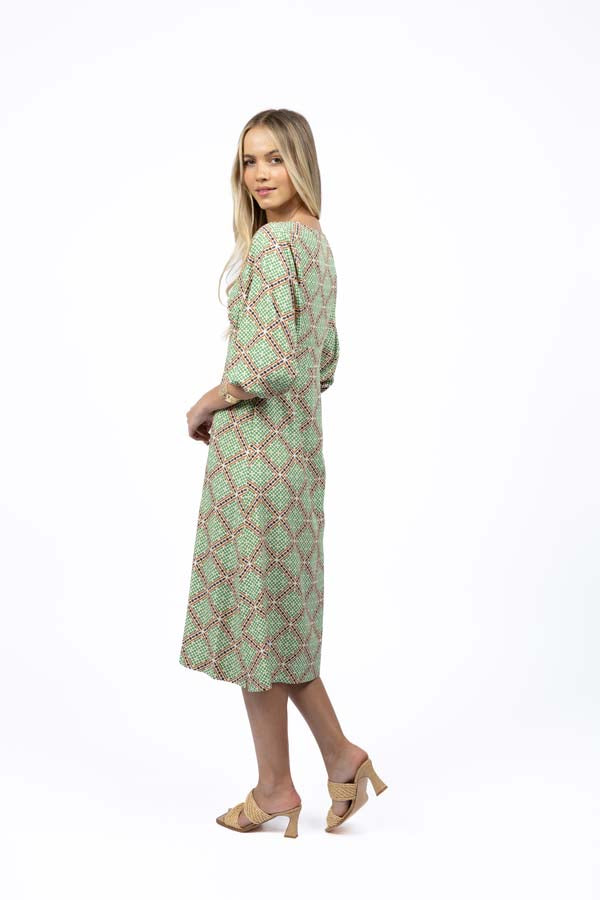 Midi Length Dress V Neck 3/4 Sleeve with elasticated hem Button Open Boodice A Line Shape Skirt Side Splits