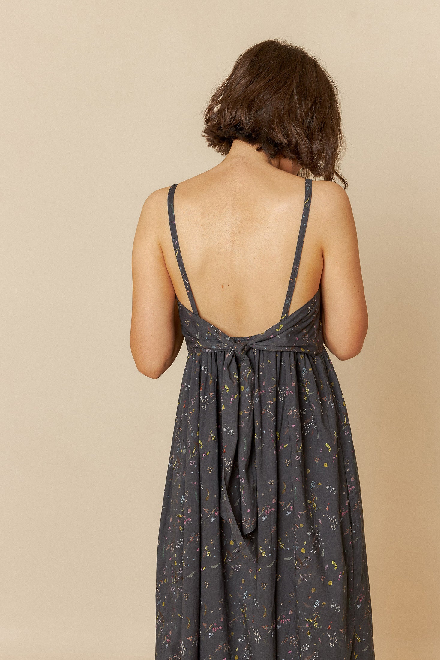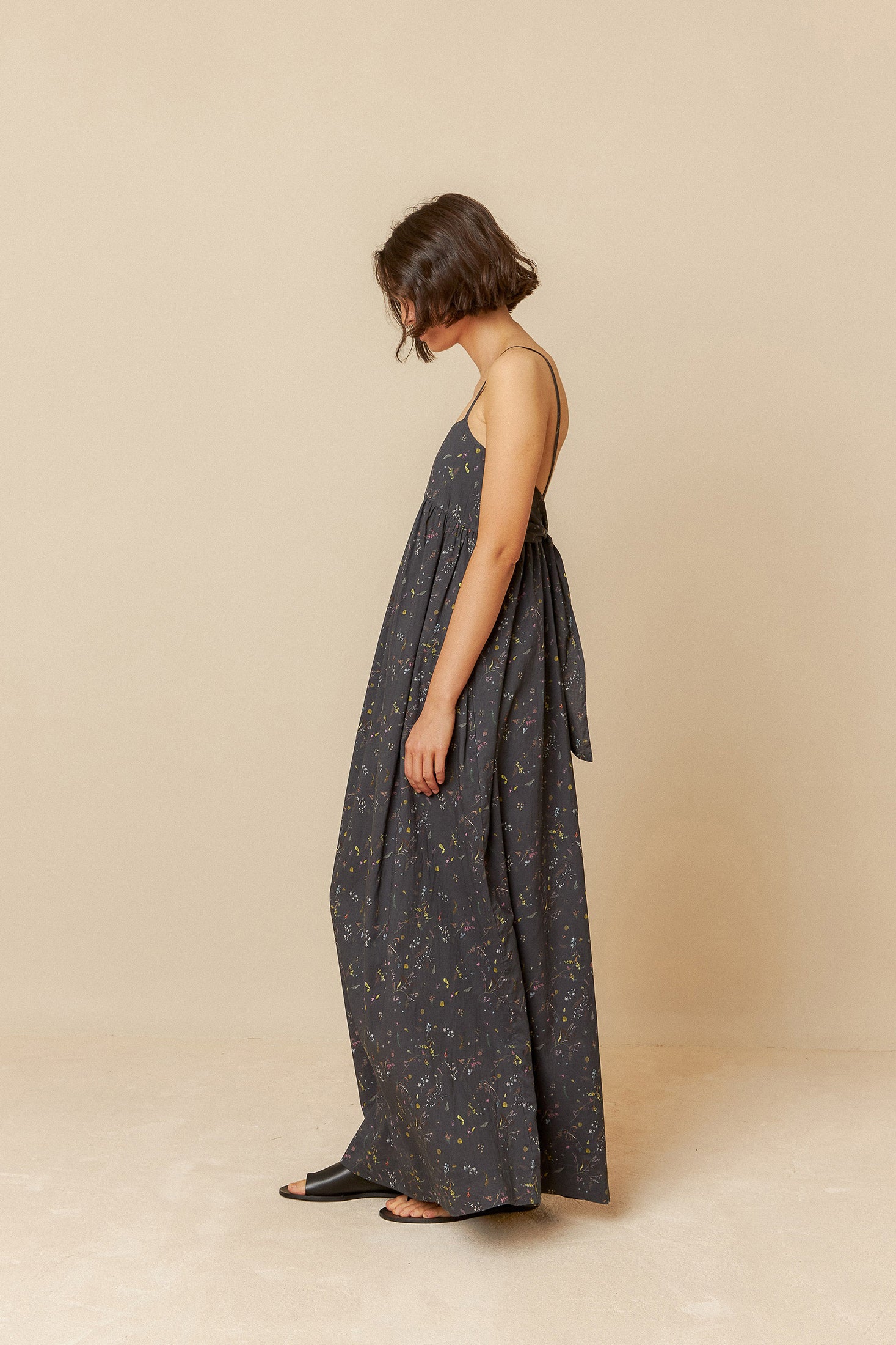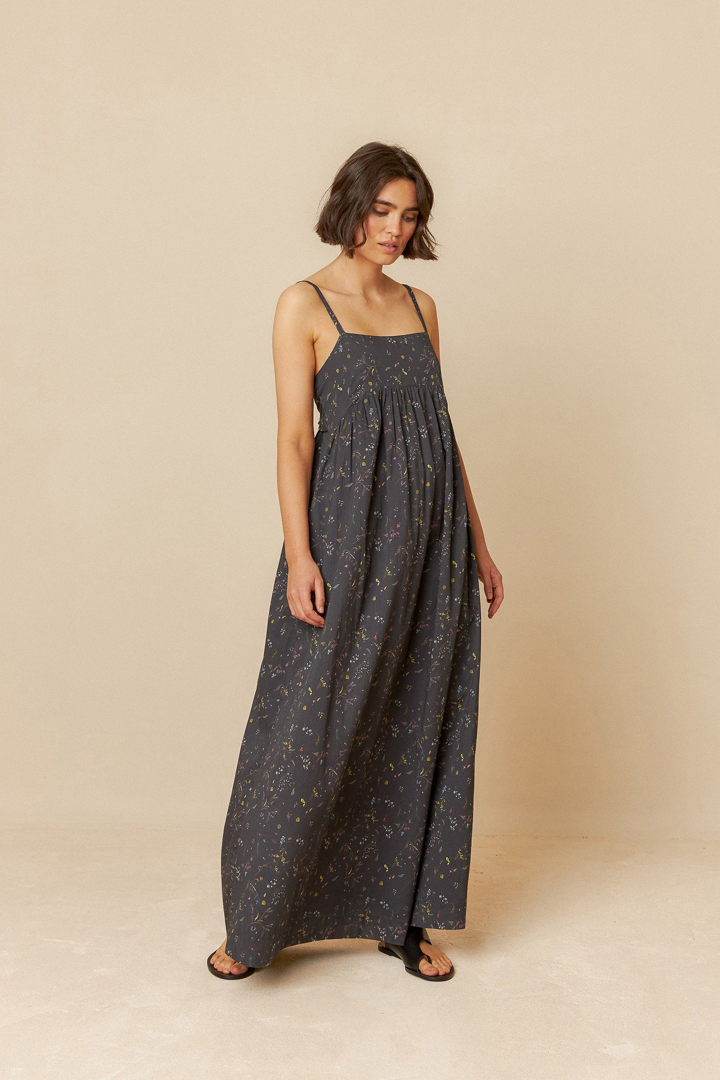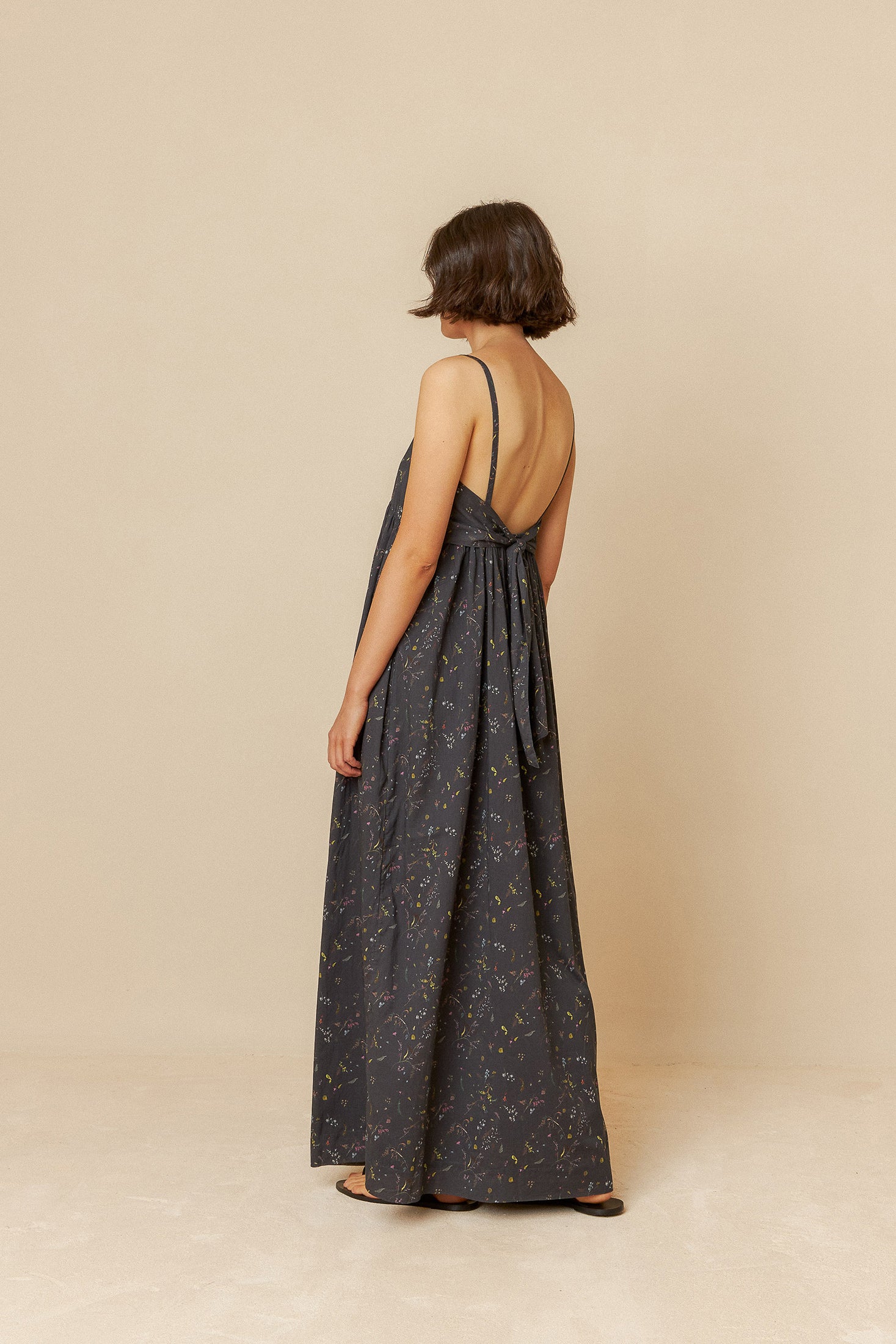 Maxi Dress Fine Meadow Floral Print - Navy Base Fully Lined Sleeveless Adjustable Straps Gathered under bust - self tie at back Fine Elastic Back for a comfort fit
