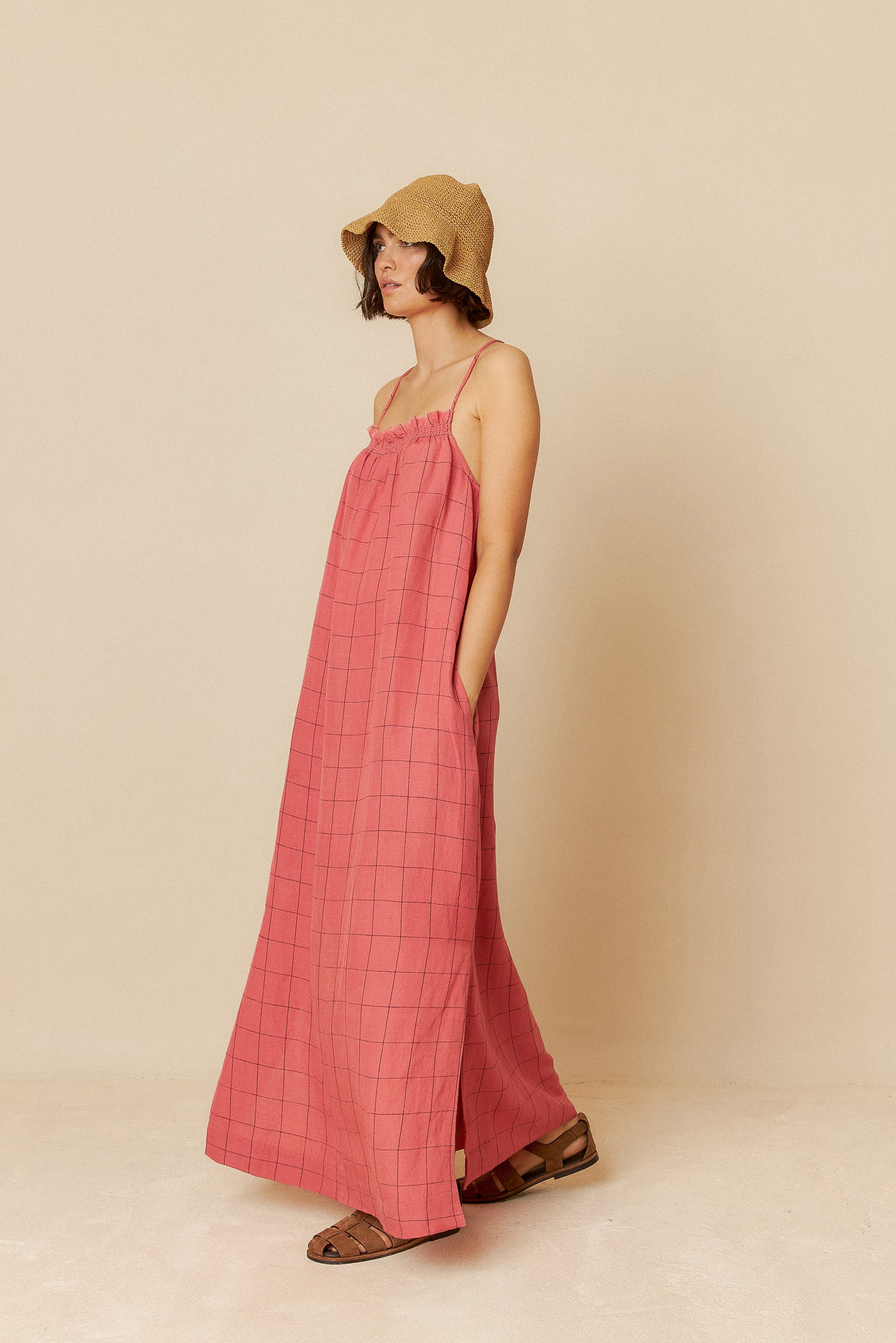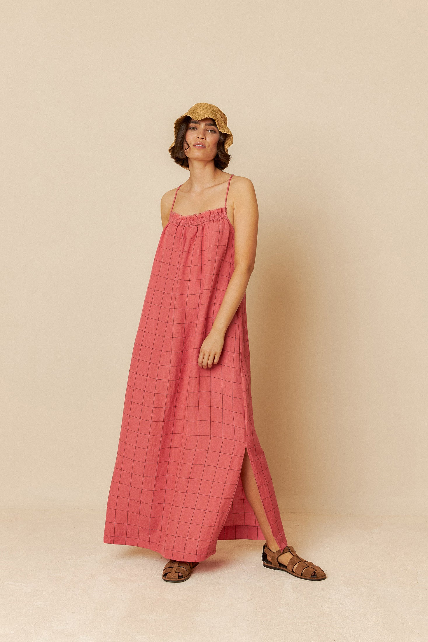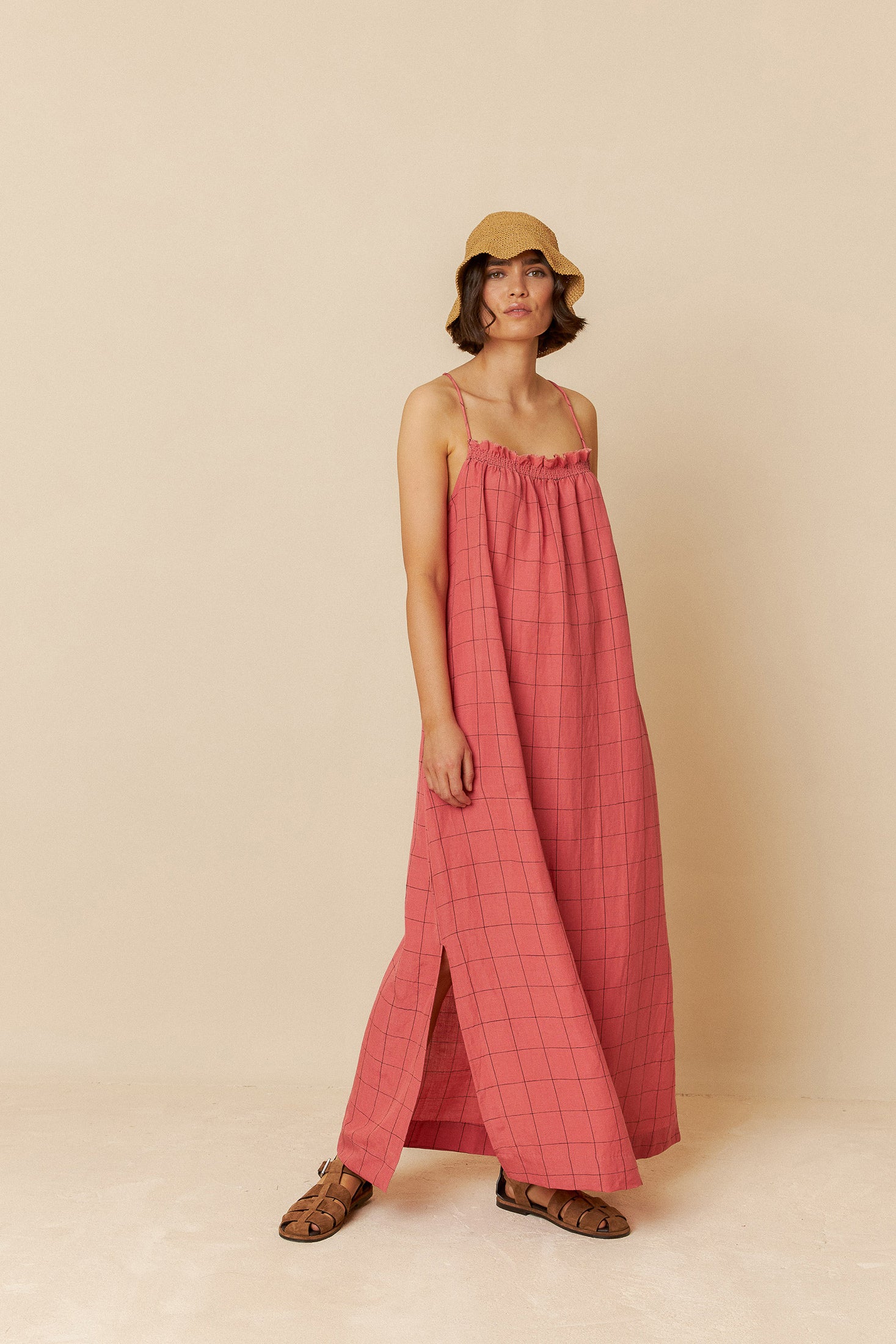 Maxi Dress Black Fine Grid Check Print Drawcord Neck tie Shirred Elastic Front Neck Ruffle Side Pockets Side Splits