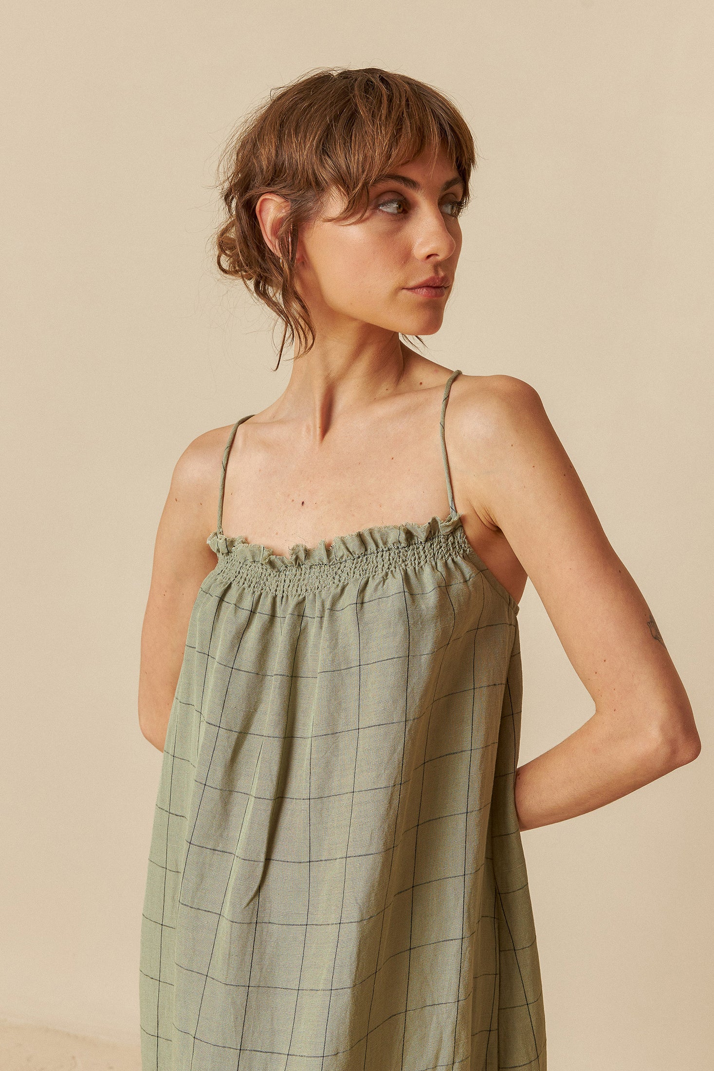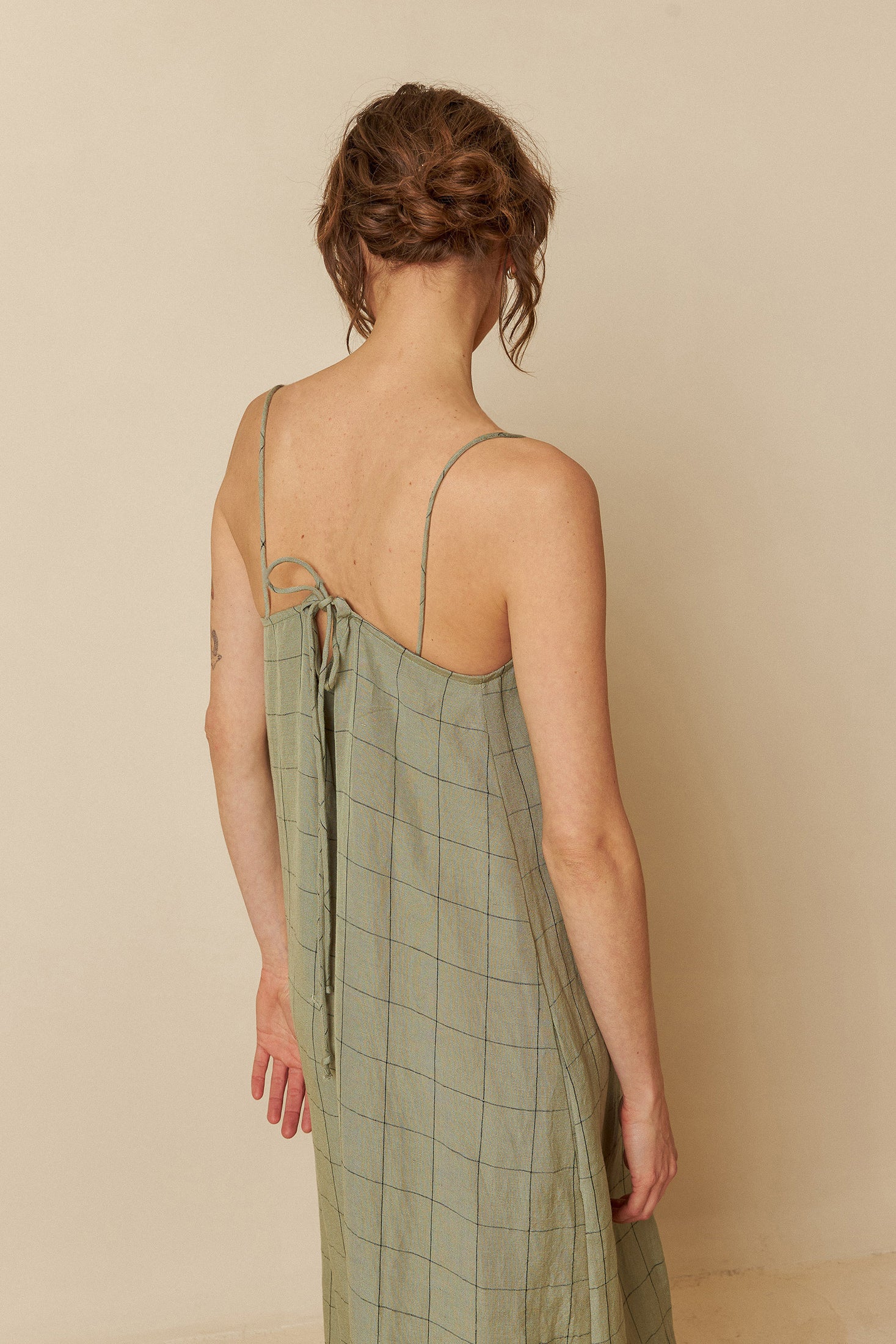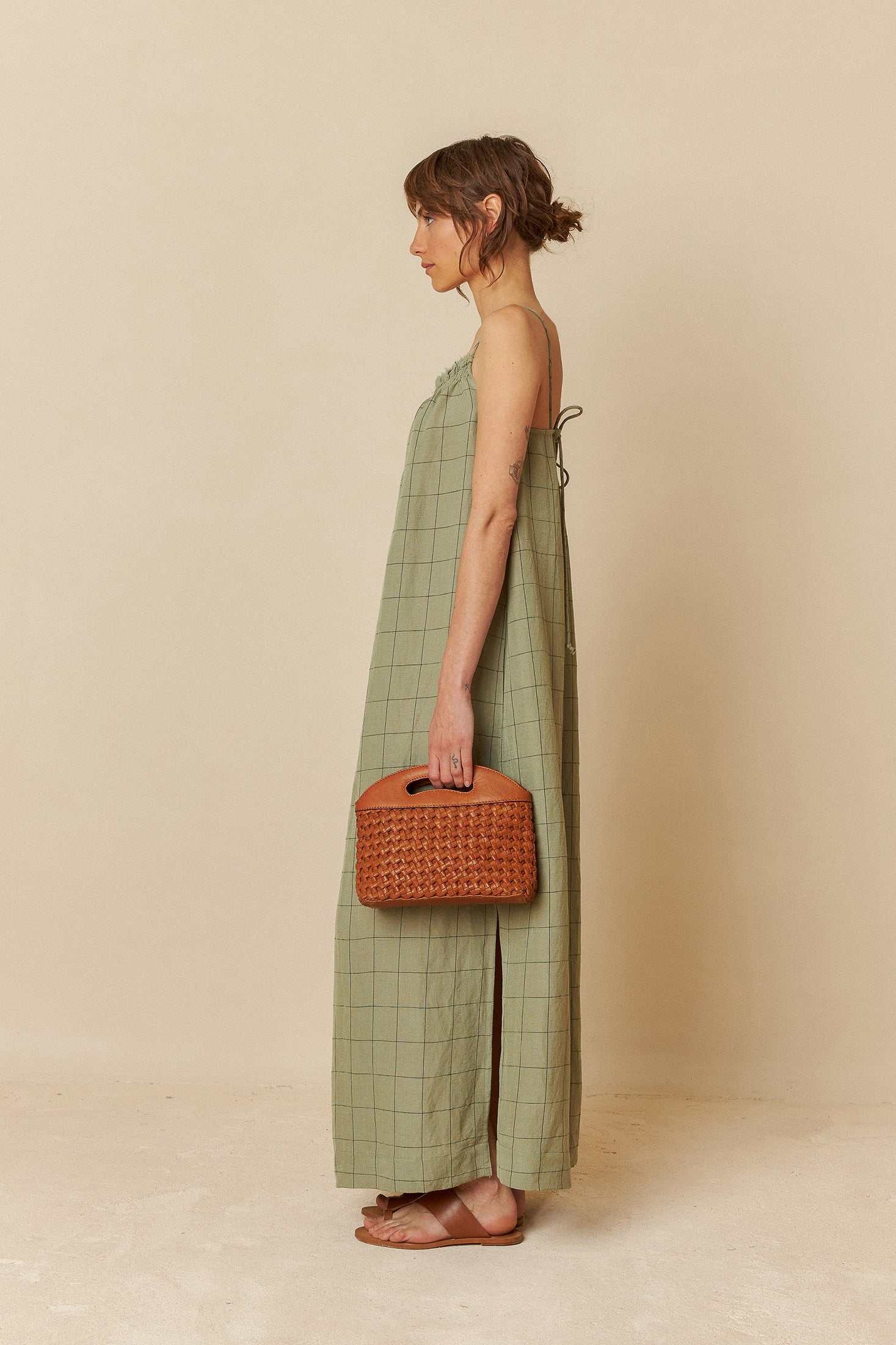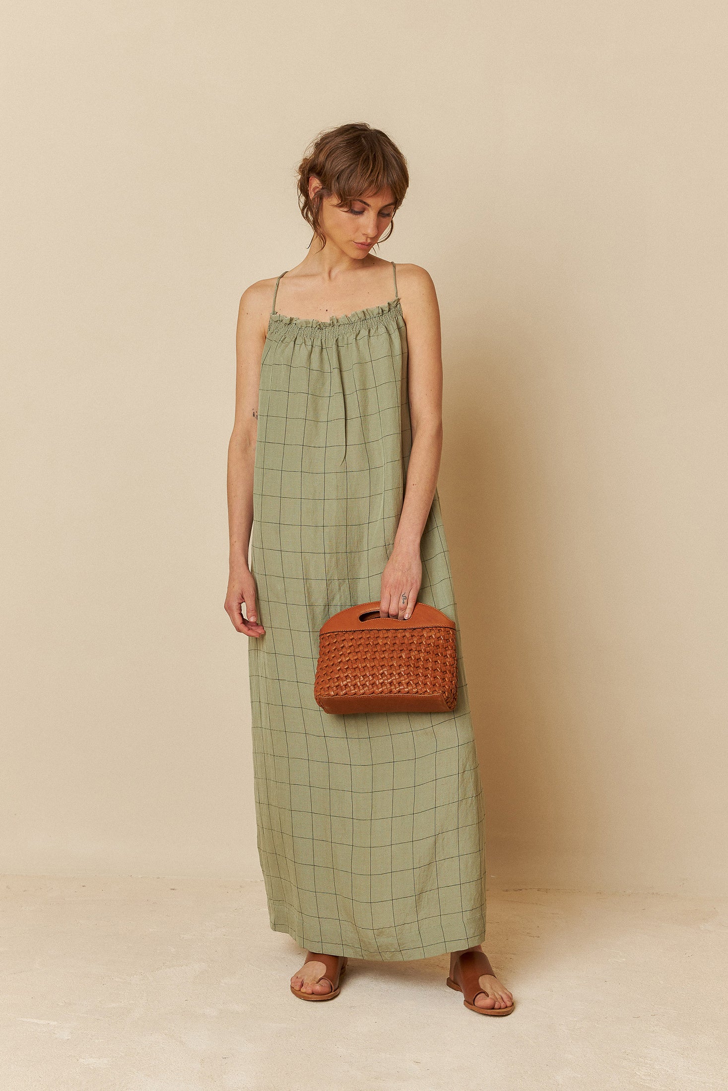 Maxi Dress Black Fine Grid Check Print Drawcord Neck tie Shirred Elastic Front Neck Ruffle Side Pockets Side Splits