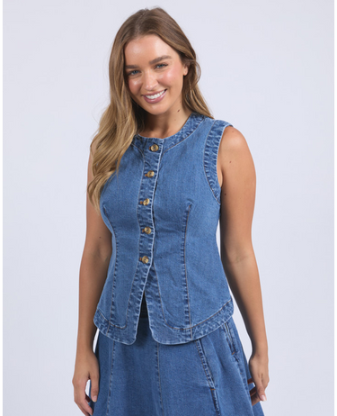A laid back timeless denim vest with a shapely silhouette, this is flattering and versatile addition for all seasons - team over a long sleeve tee or fitted knit through the cooler months.