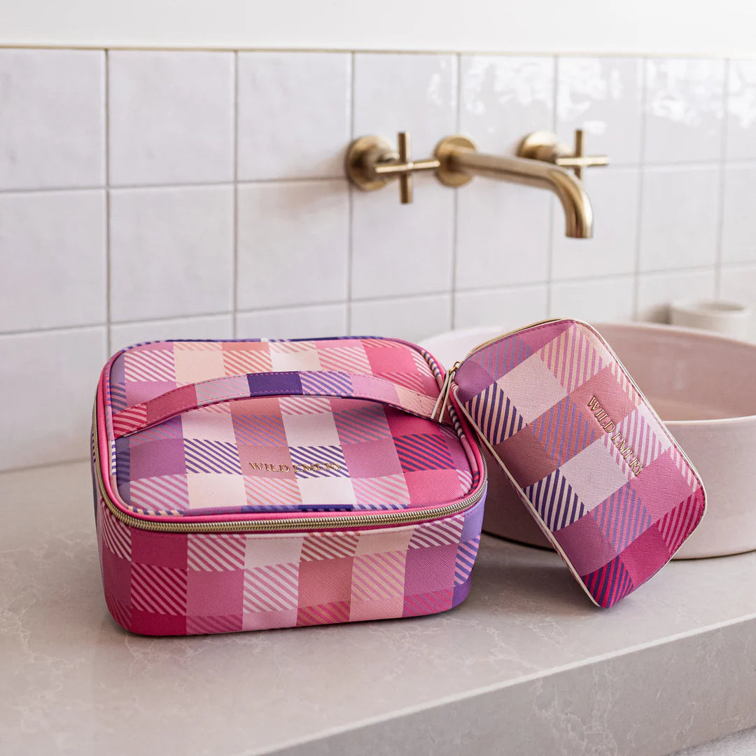 Large Toiletry Case Featuring gold accent zippers Internal zipped pocket custom printed lining Convenient handle for easy carrying.