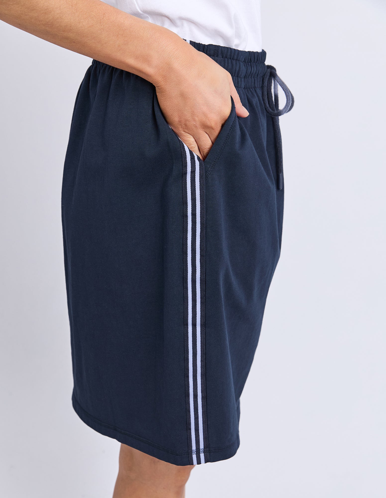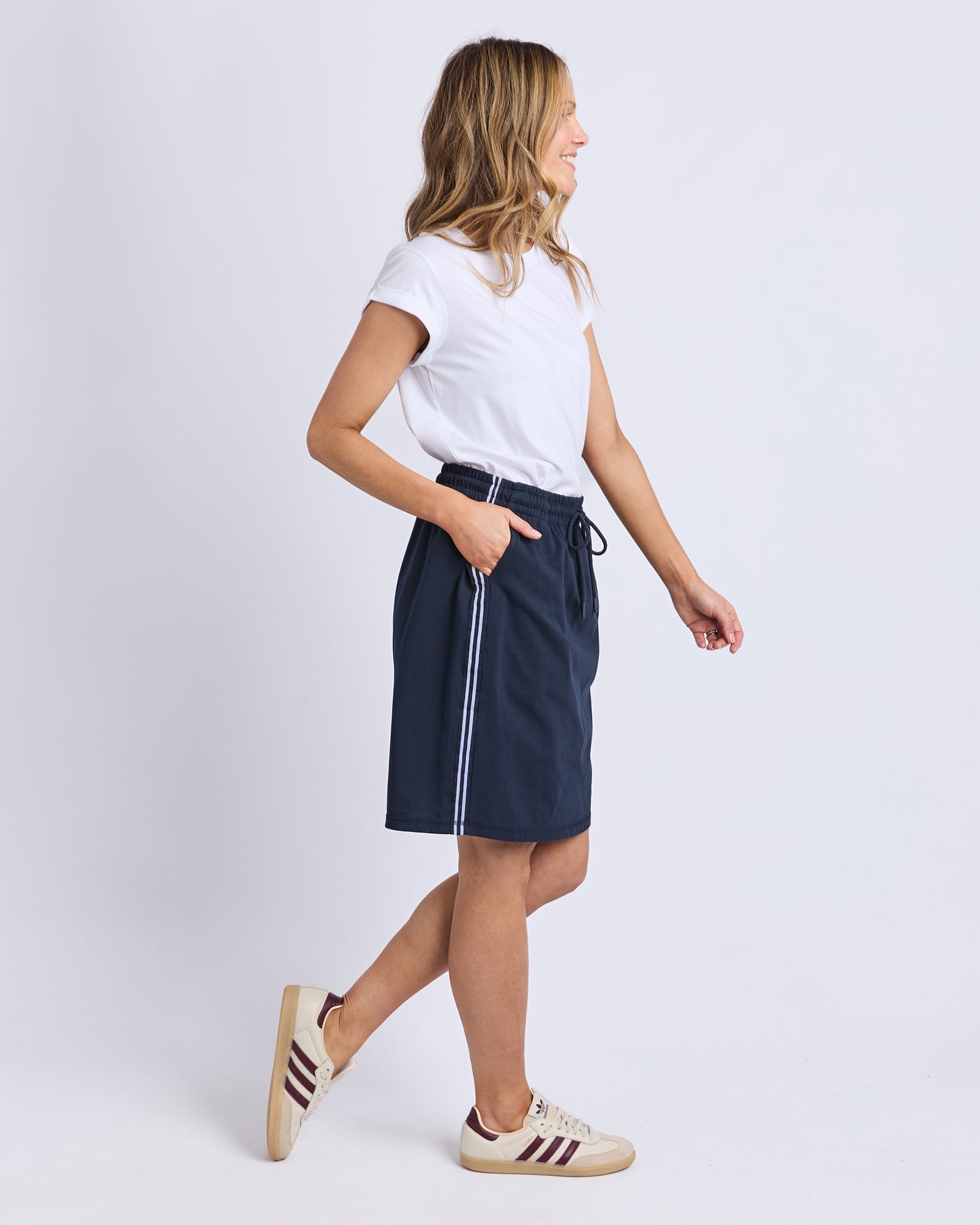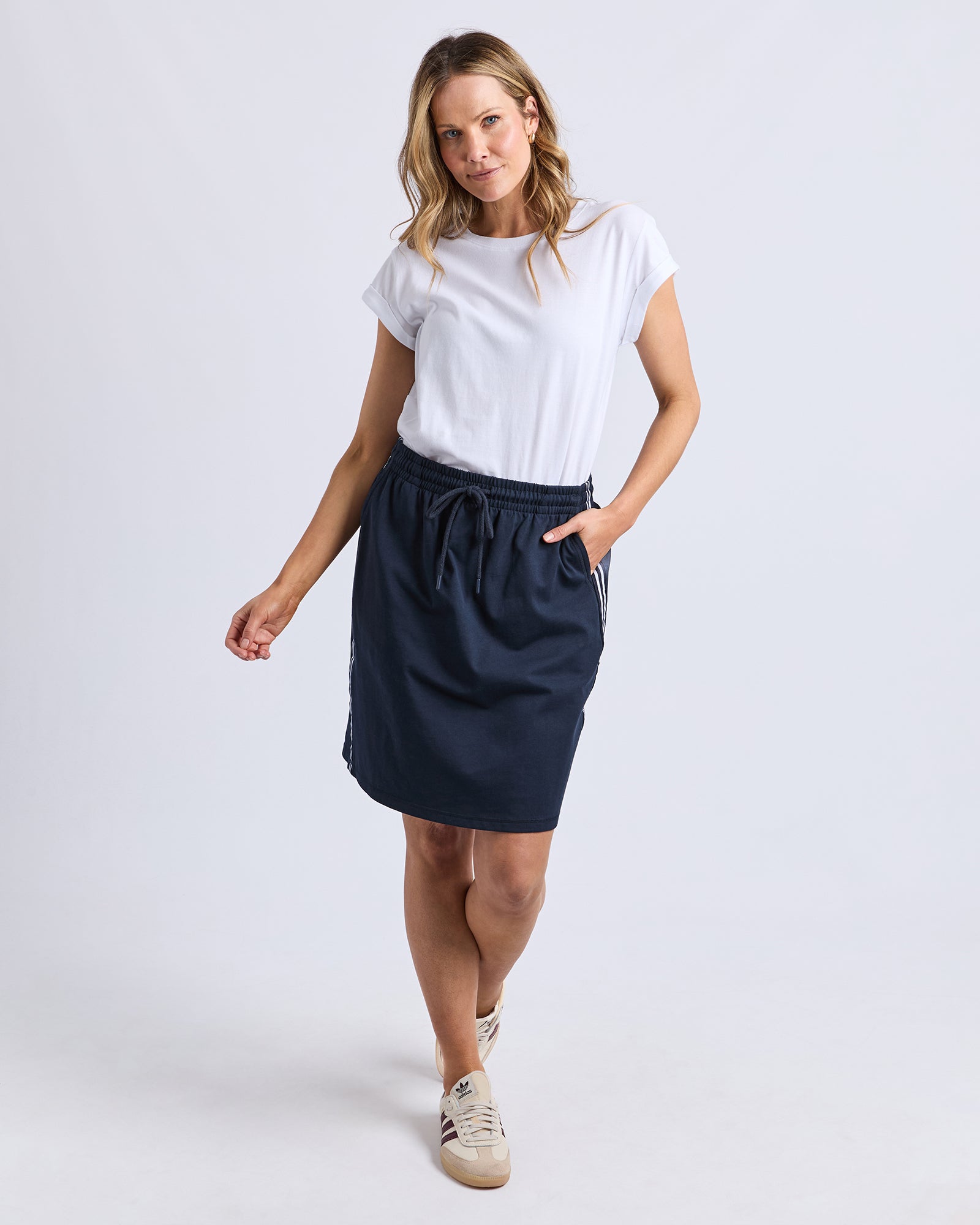 Knee length skirt Elastic Waist with drawcord Side pockets Side Tape Feature