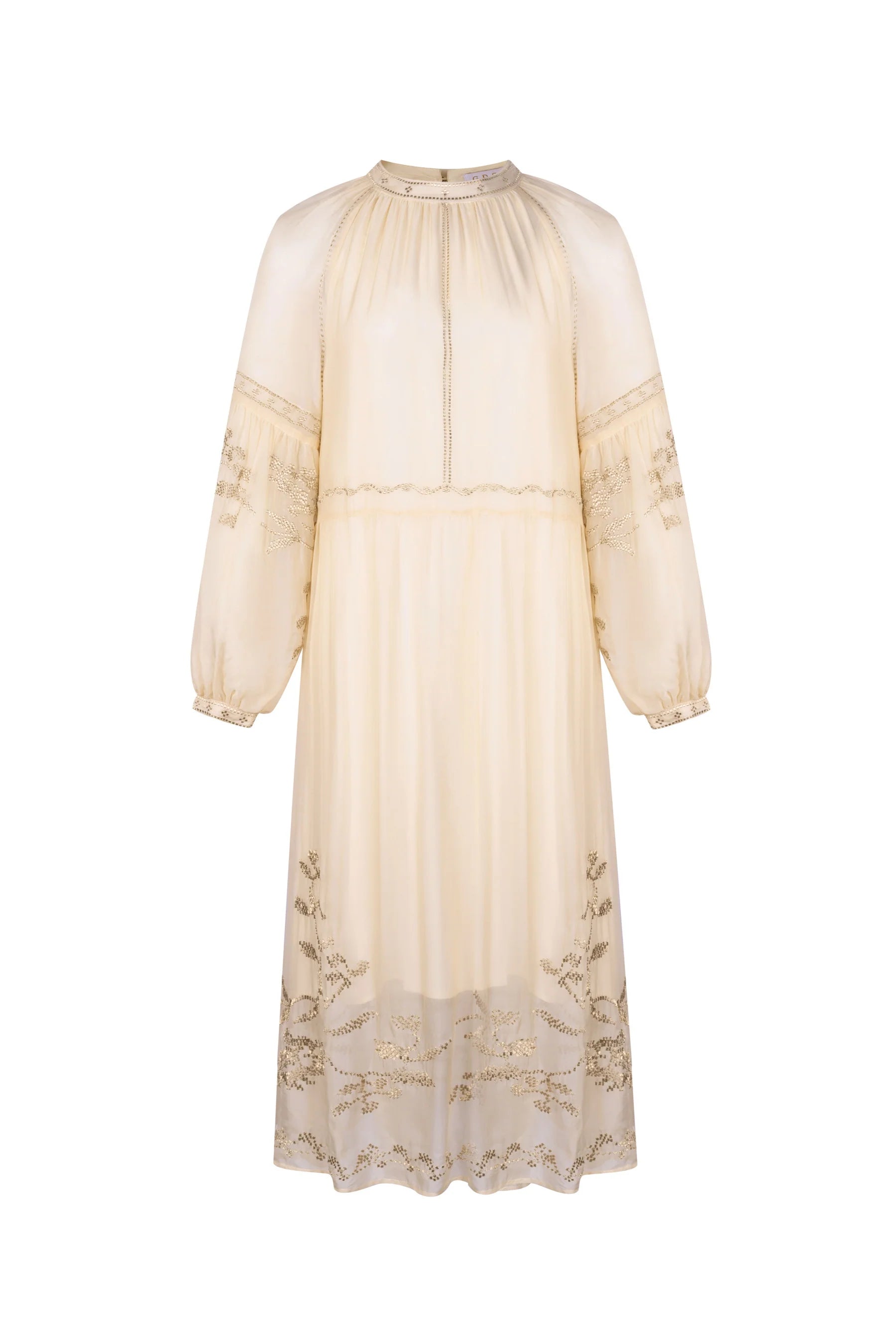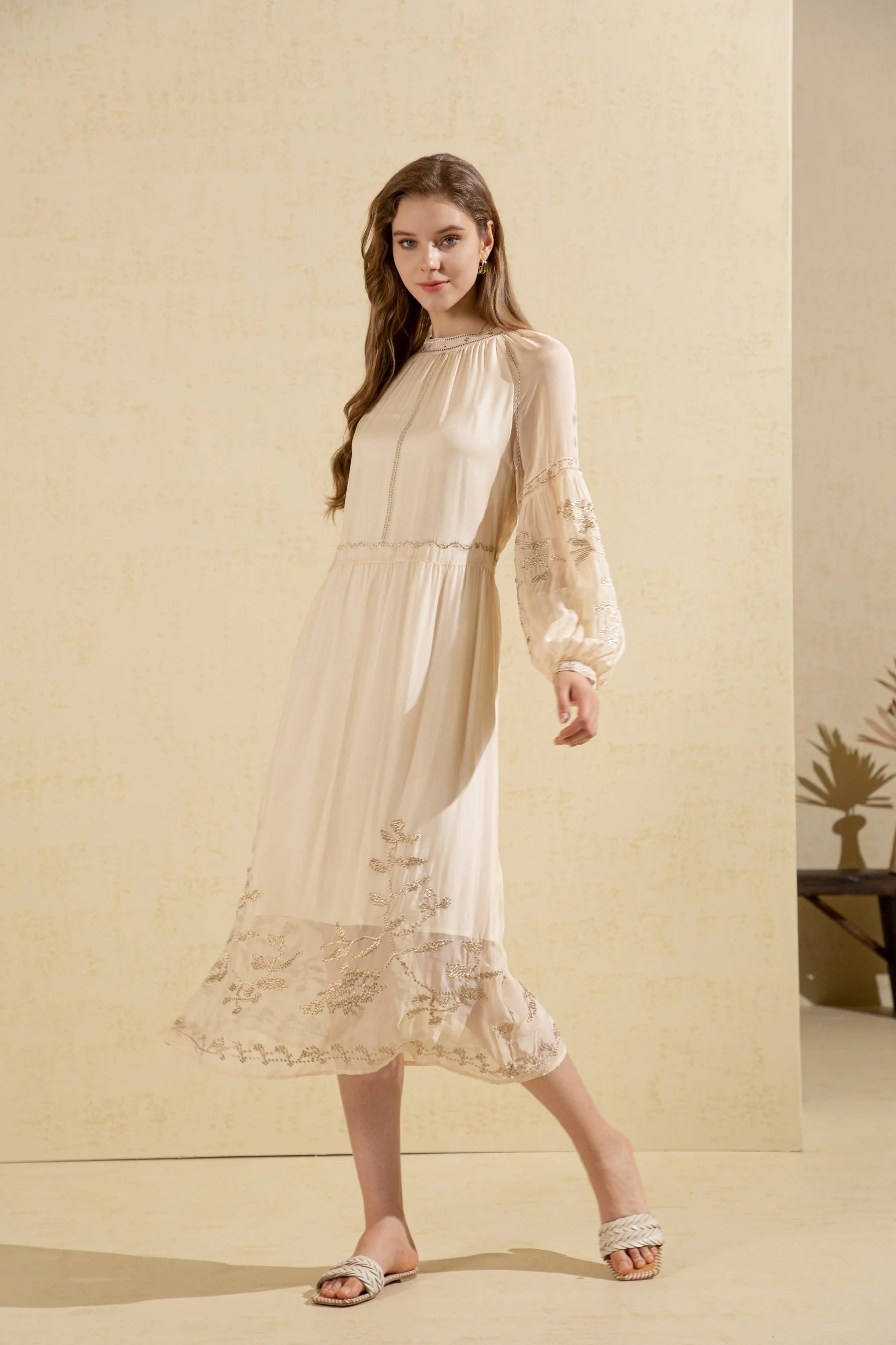 This exquisite long dress features a sophisticated round collar and is crafted from delicate, transparent silk. The intricate embroidery adds a touch of elegance, making it perfect for special occasions.