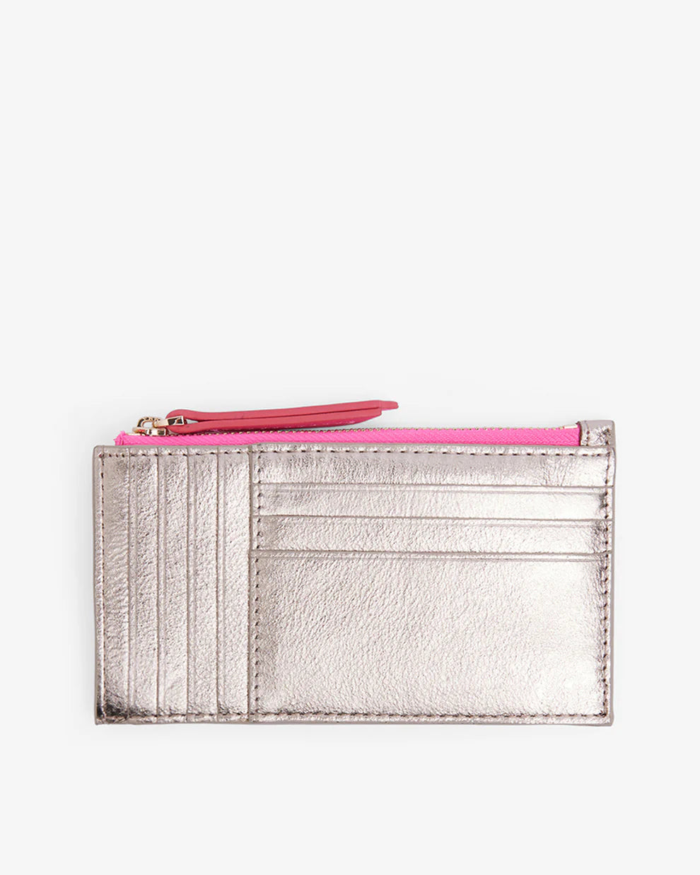 Closure: Top zipper with leather zipper pull Externals: 8 card slots Logo: Embossed logo Height: 8cm Width: 14.5cm Depth: 1cm
