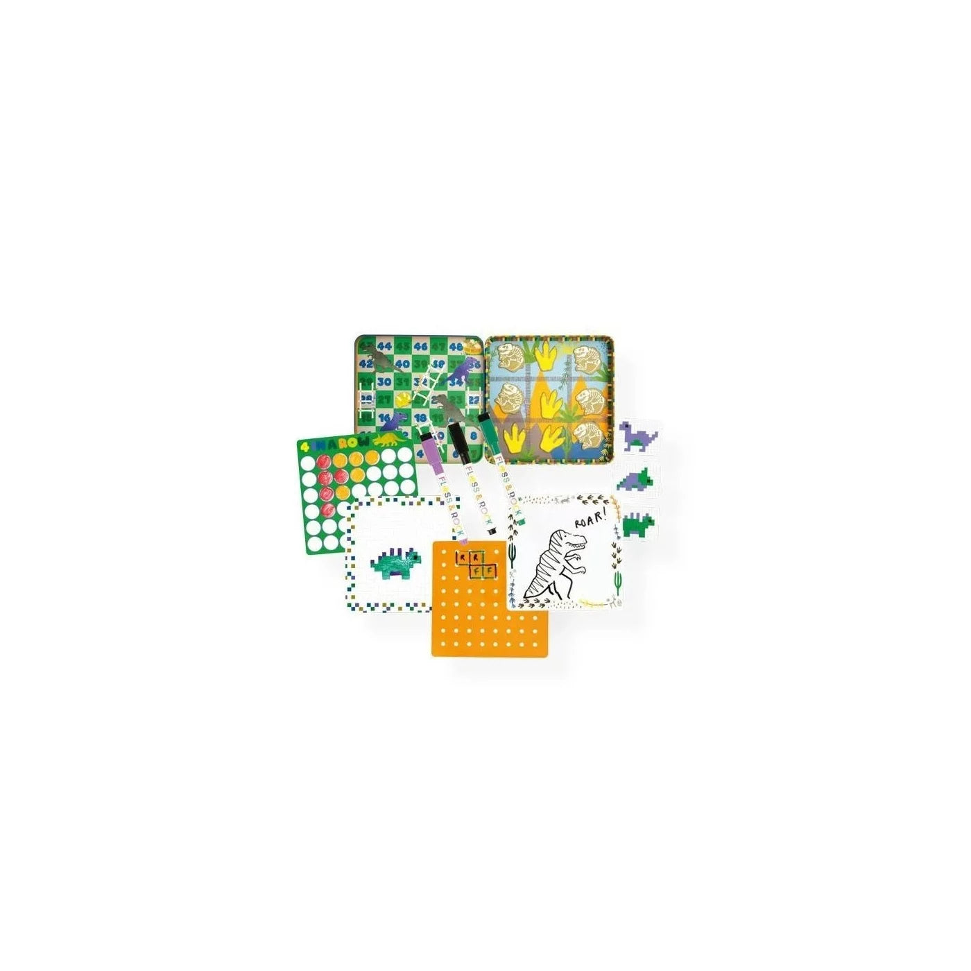 Includes 6 activities and games - ‘Snakes & Ladders’, ‘Tic Tac Toe’, ‘Pixel Art’, ‘4 in a Row’, ‘Dots & Boxes’ and a doodle page! Each tin is reusable and comes with magnetic pop-out pieces, 3 colour dry wipe pens with erasers and a dice for game play!
