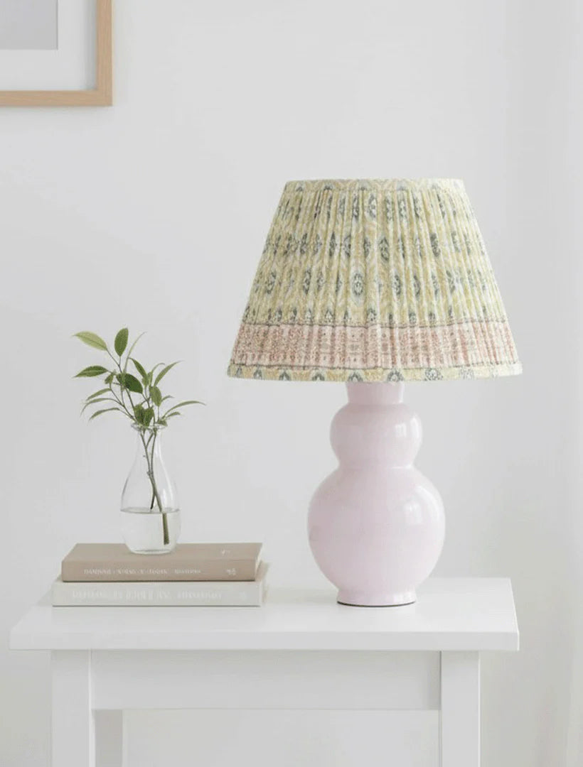 Bring gentle colour and timeless charm into your home with the Boughton Lamp. Featuring a soft green ceramic base and a soft pleated floral shade it is absolutely perfect for styling on a bedside table, console or reading nook.