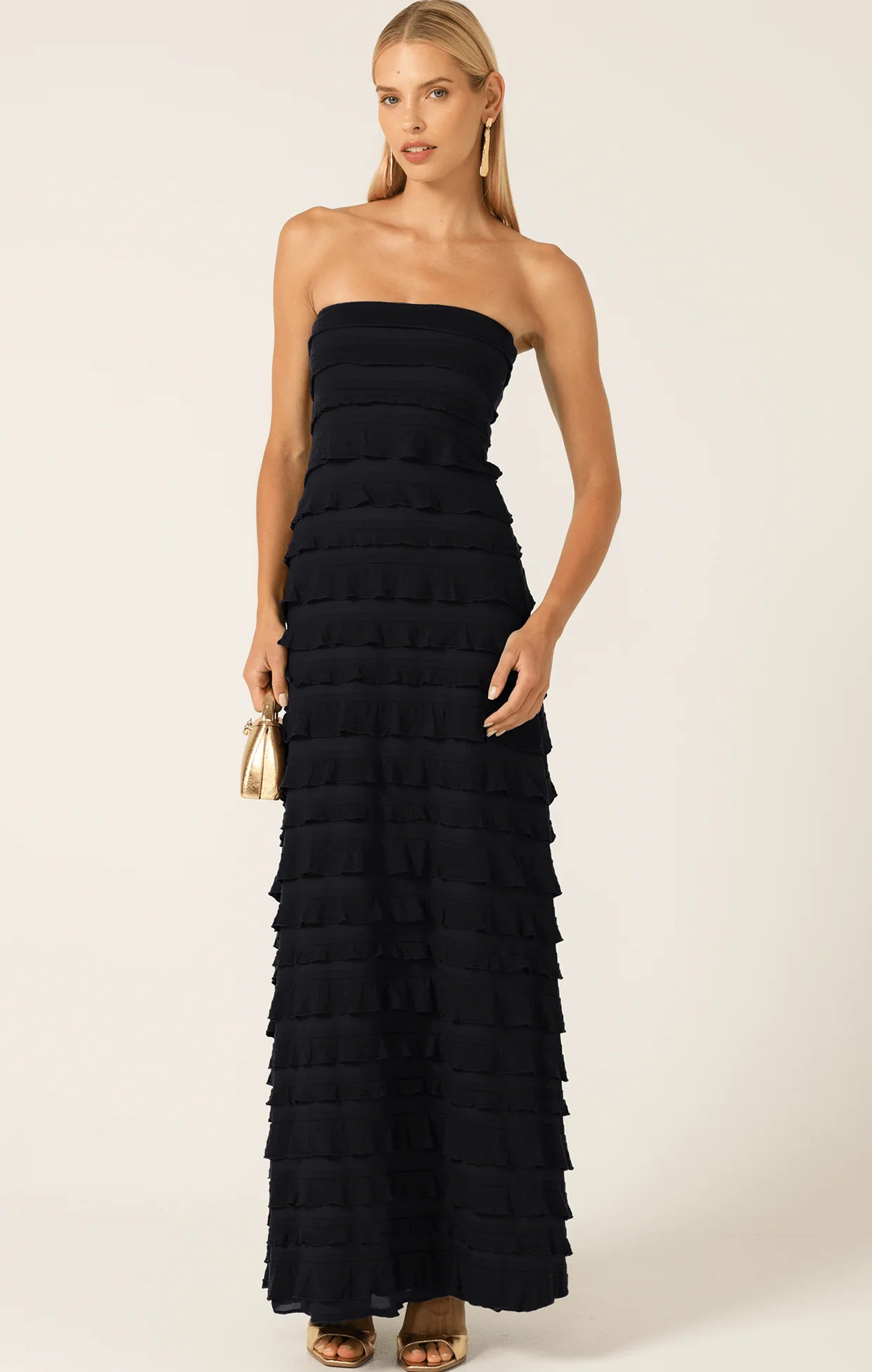 A master in versatile dressing, the Maddison Dress is crafted from a stretch jersey fabric with tiered jersey frills that are extremely complementary to the body. Fitted at the bust, this strapless silhouette skims the rest of the body to create a flawless fit.