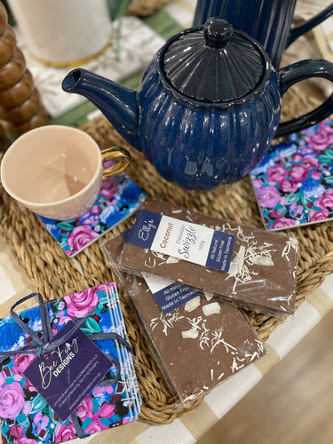 A set of 4 10 x 10cm ceramic and cork coasters.