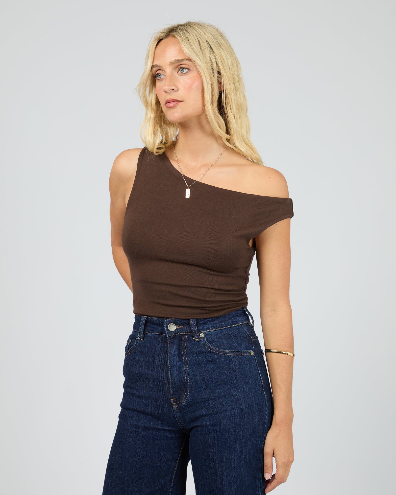This off-shoulder stretch top combines effortless style with a comfortable fit. Crafted from a soft, stretch fabric, it hugs the body while the asymmetric off-the-shoulder design adds a touch of elegance to any outfit.