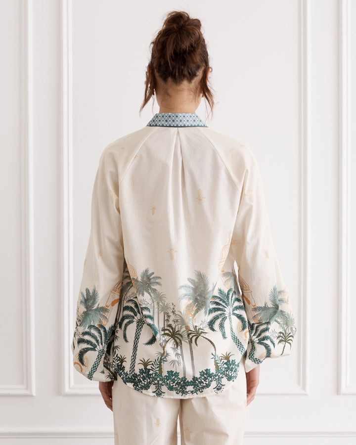 Long Sleeve Blouse Button Through Front Collar Ivory Gold edged Buttons Raglan Set Sleeves Slight Blouson Sleeve with Elastic Cuffs Designed In Australia