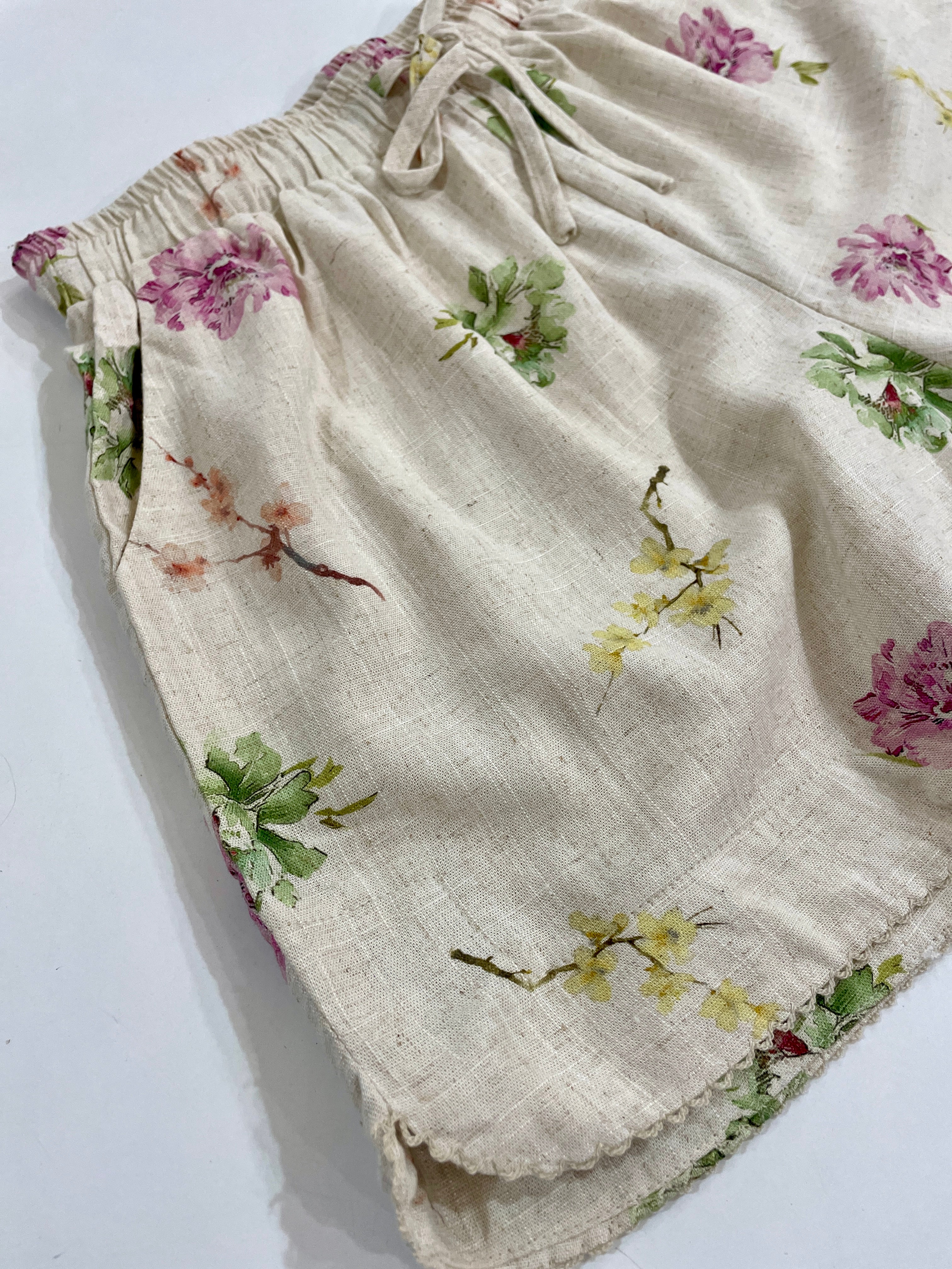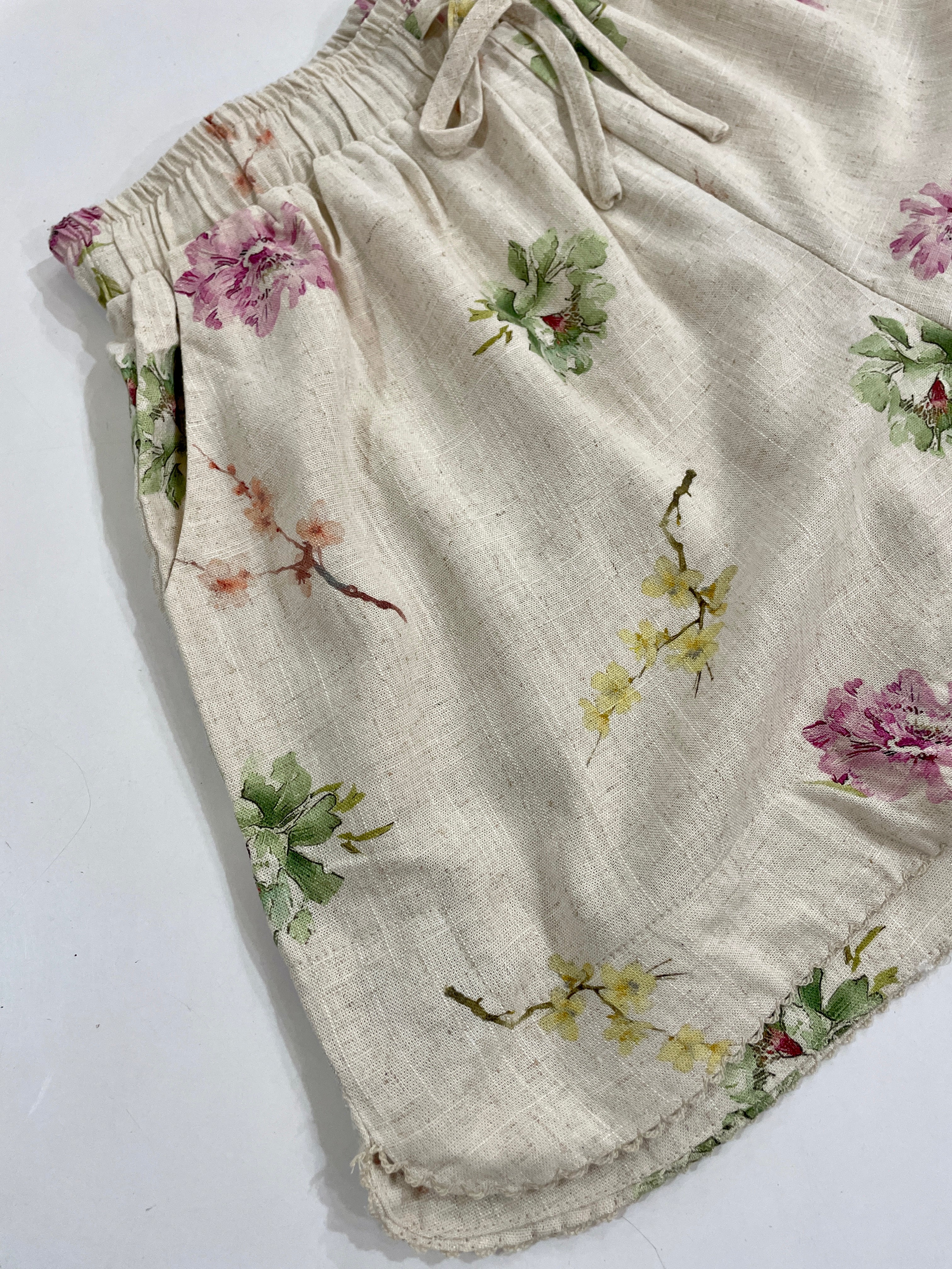 Don't miss these blooming gorgeous shorts, set on a natural linen base, then edge trimmed with a delicate embroidered scalloping they are truly the sweetest and are fully lined for comfort on even the hottest days.