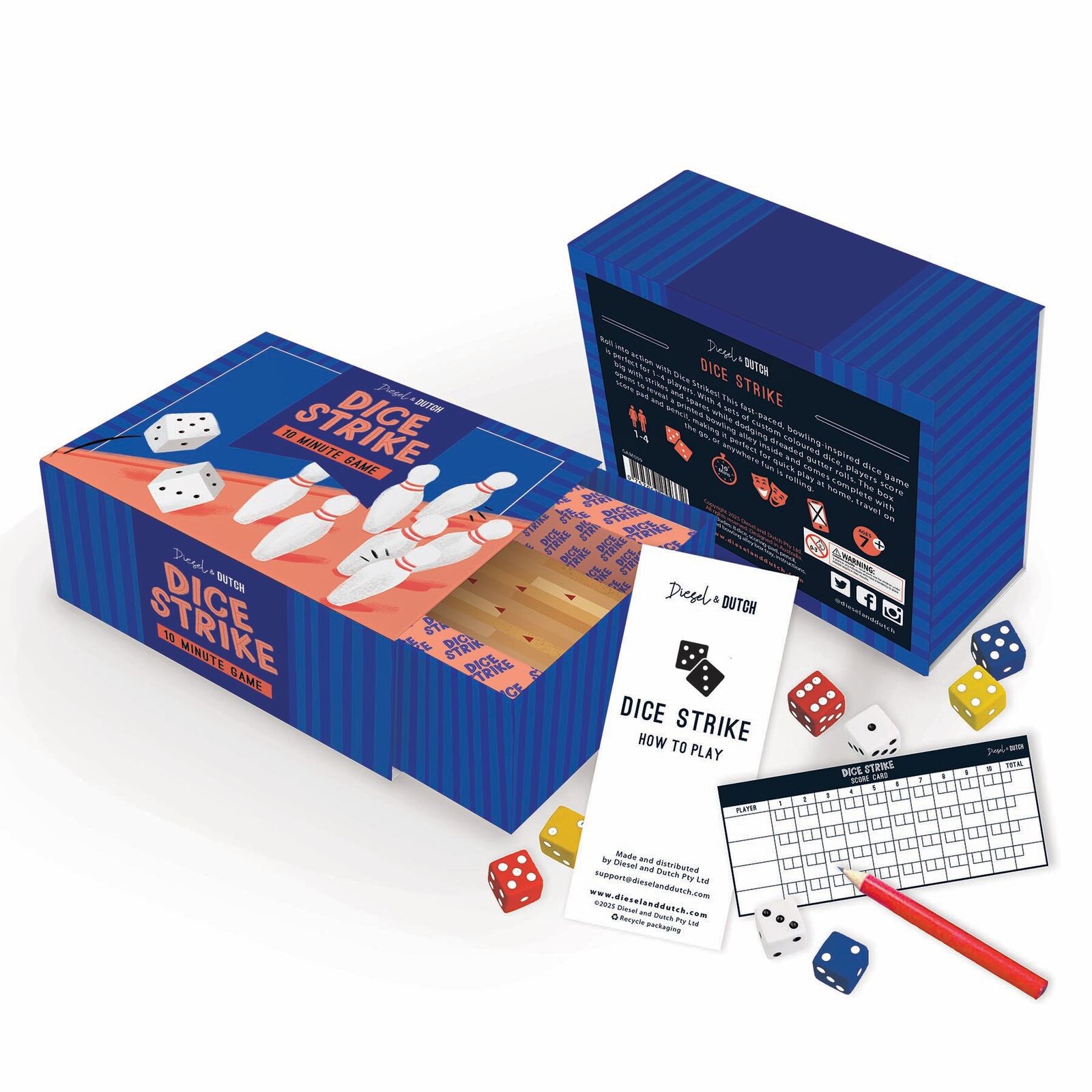 Roll into action with Dice Strikes! This fast-paced, bowling-inspired dice game is perfect for 1 to 4 players. With 4 sets of custom coloured dice, players score big with strikes and spares while dodging dreaded gutter rolls.