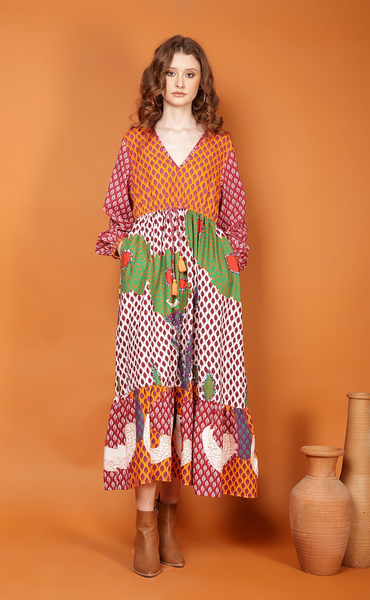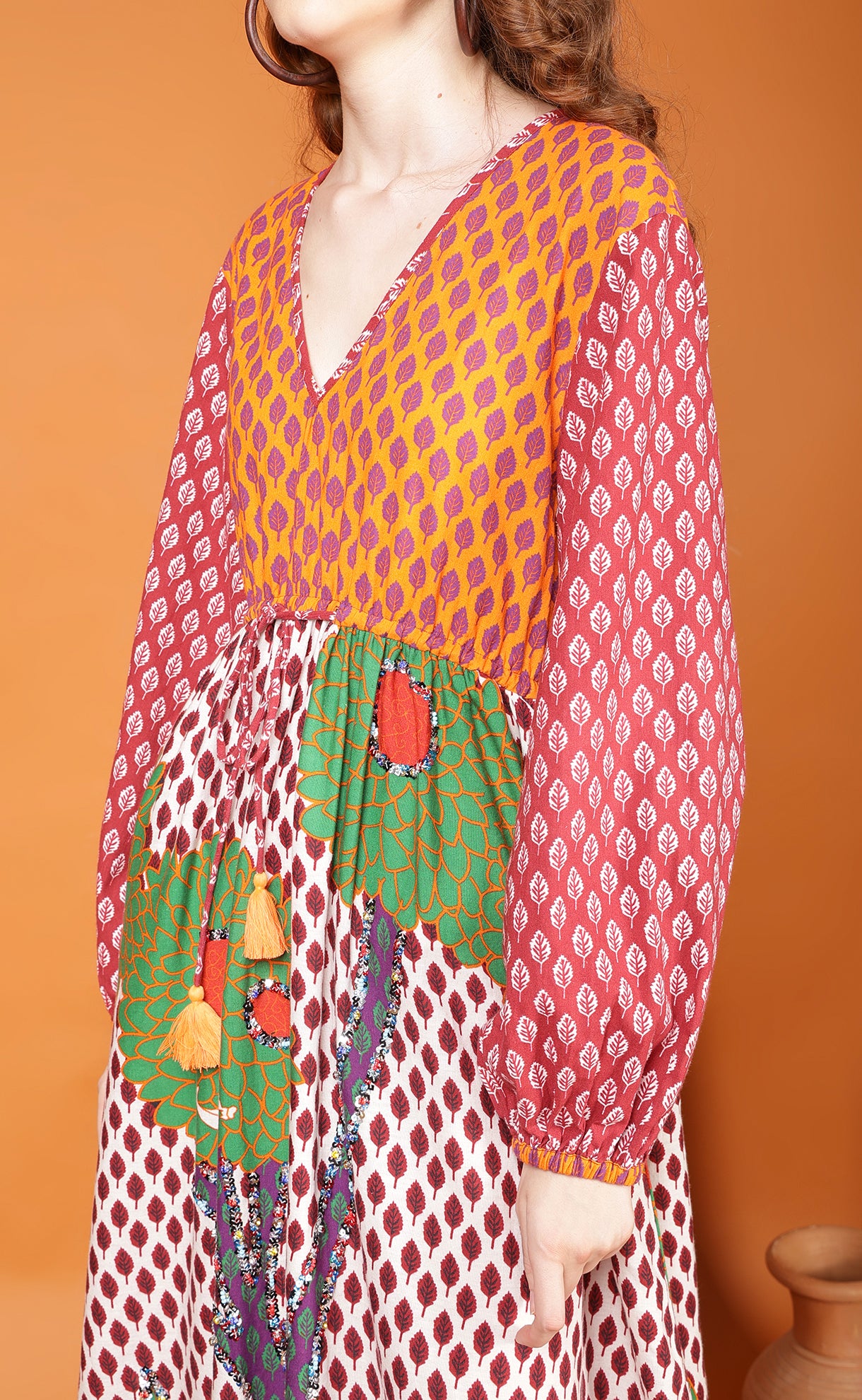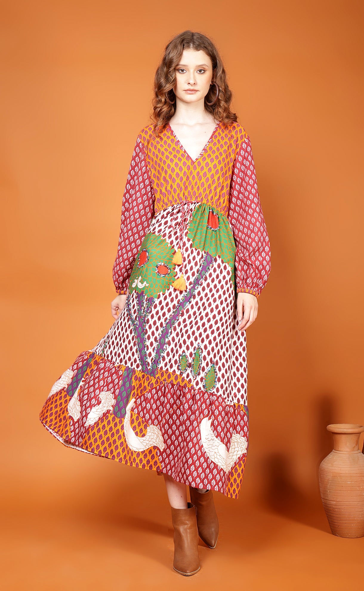 Long Sleeve with elastic cuff V Neckline Under Bust Elastic Gathered Tiered Skirt Hem Sequin trim across some pattern