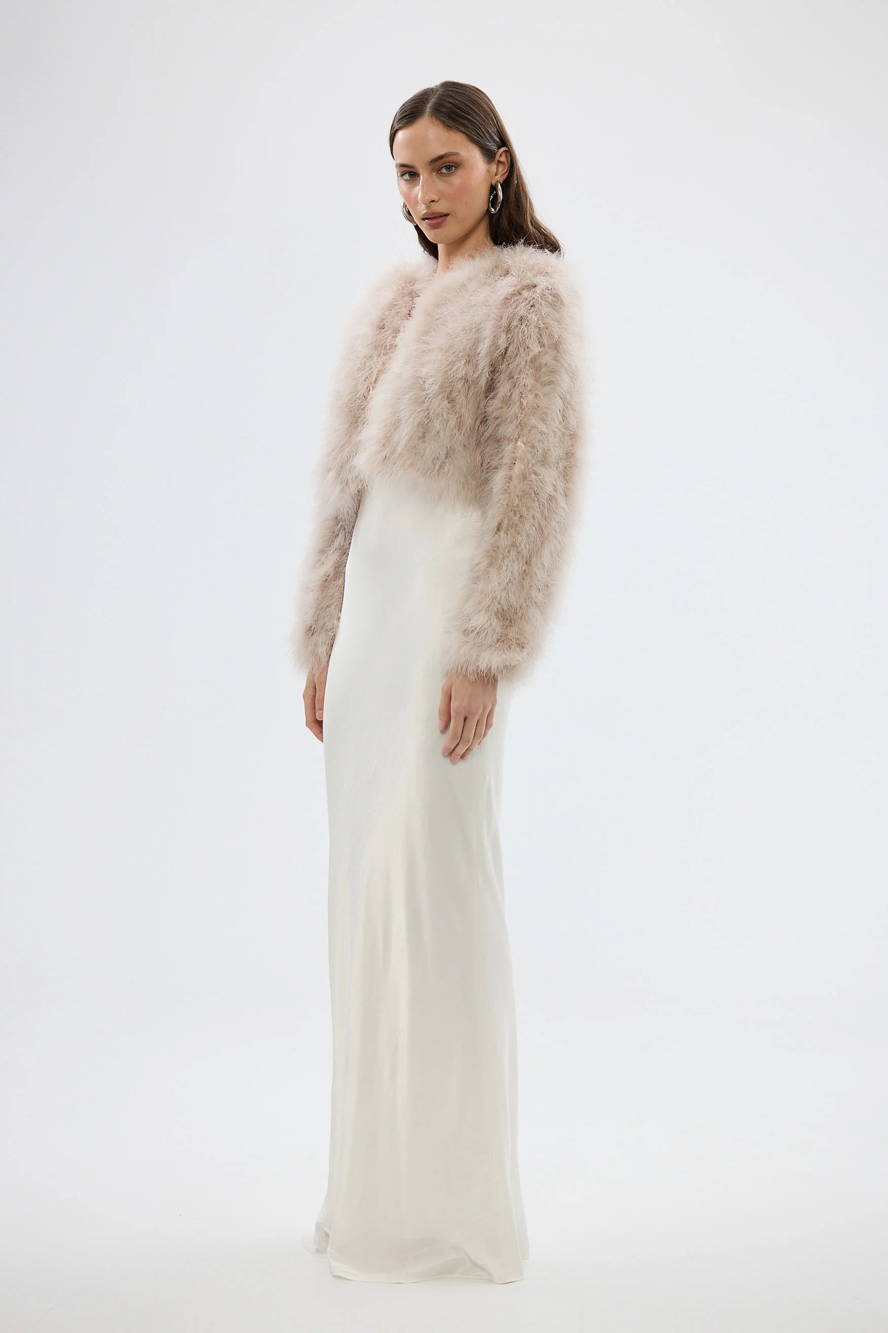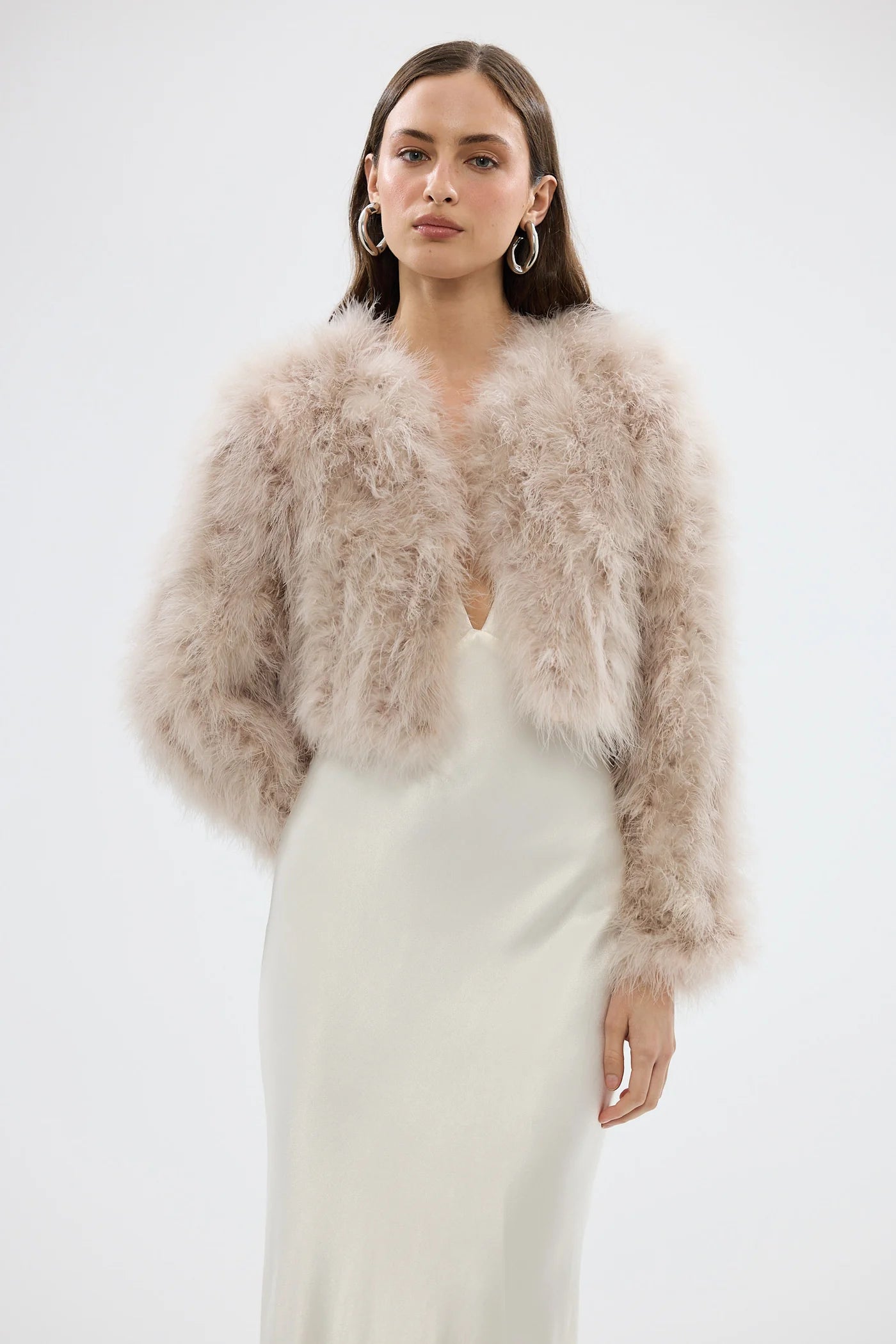 Crafted from luxurious marabou feathers, this best selling jacket features a structured shoulder and feminine cropped silhouette designed to make a statement. Perfect for layering over dresses or paired with denim, it’s the ultimate statement piece for evening events and special occasions.